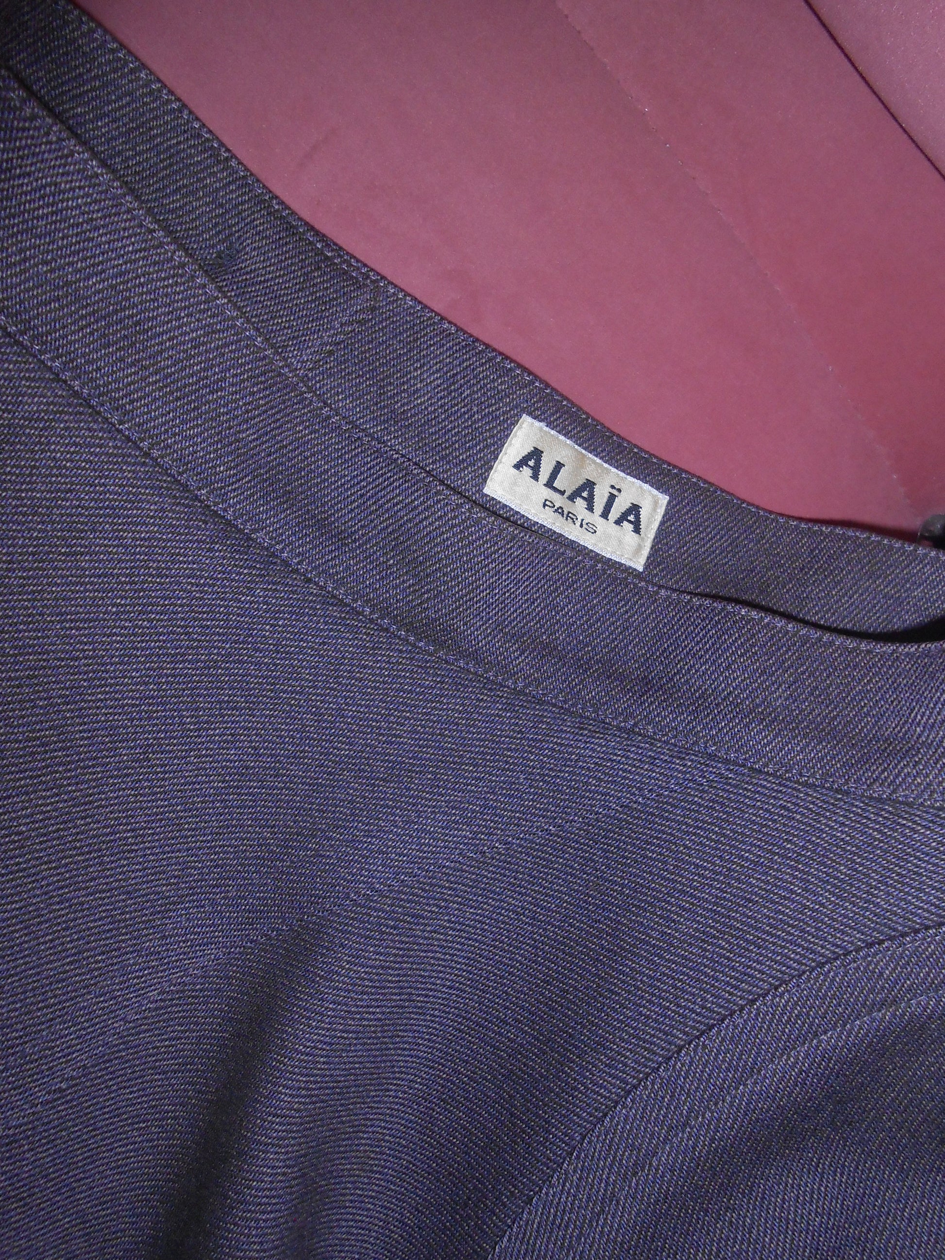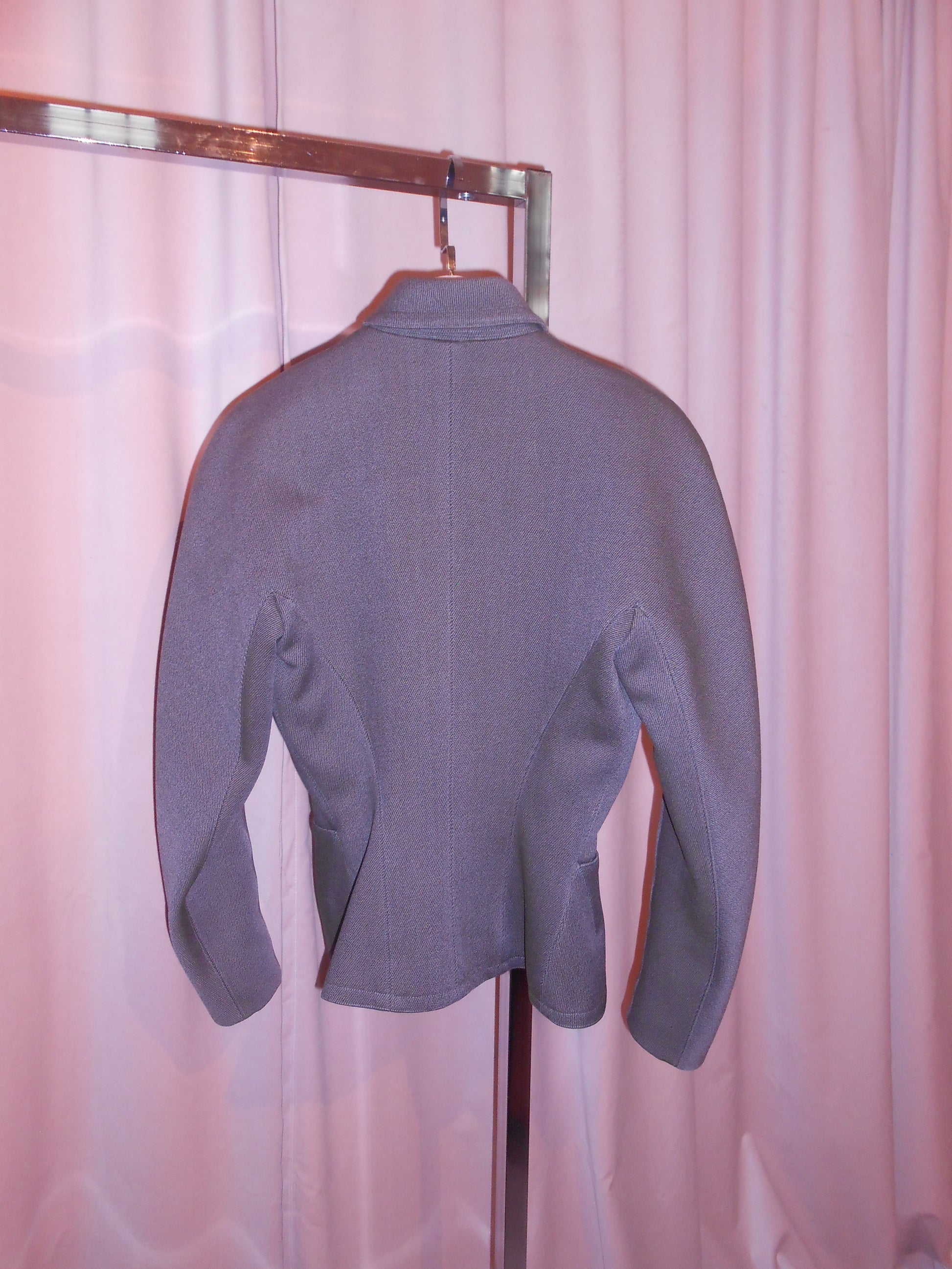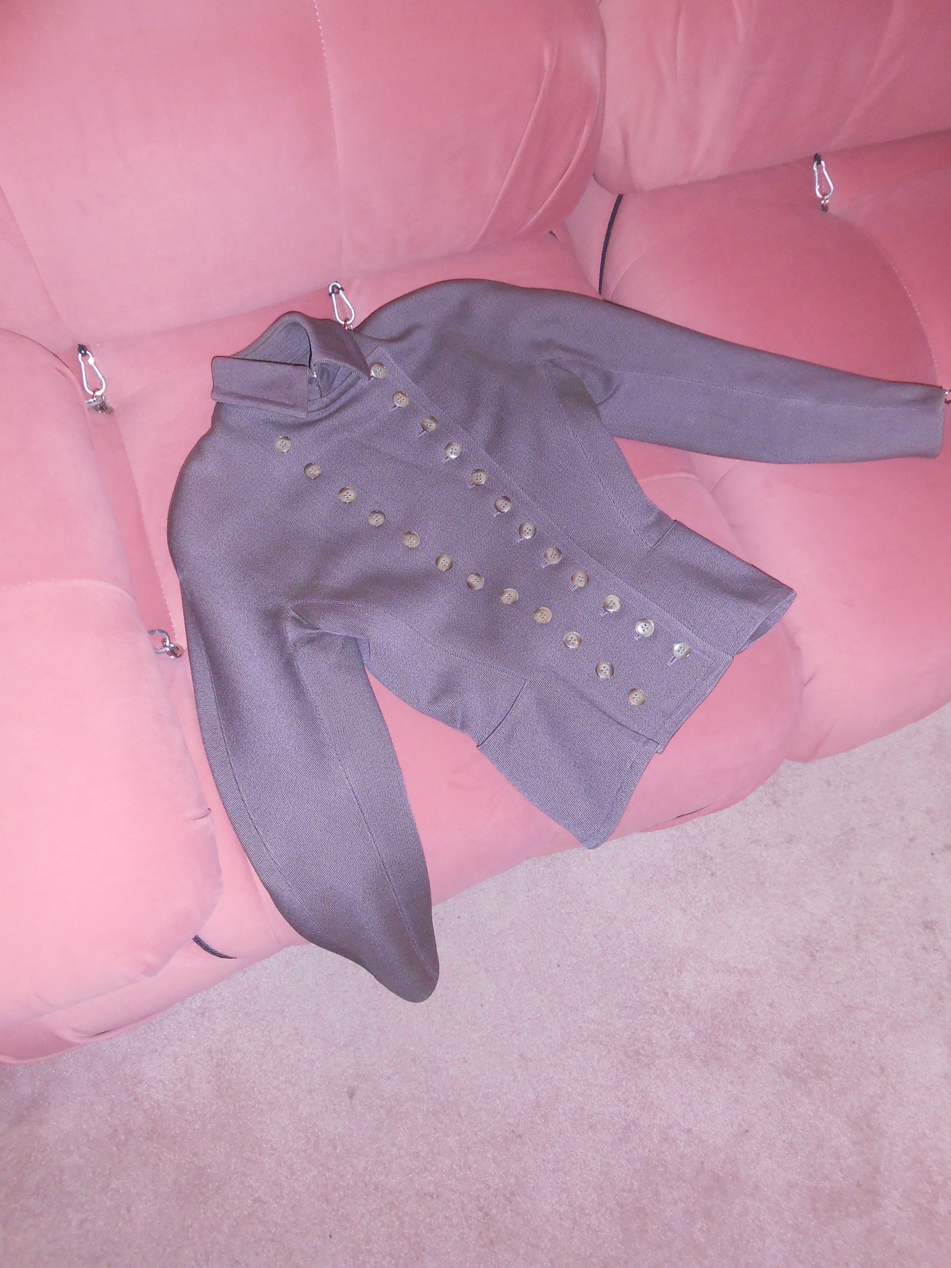 DESCRIPTION : The ever iconic military style structured jacket & skirt set from Alaia's FW 1987 runway collection. Done in a rich wool, the jacket has gorgeous standalone structure with balloon sleeves and a high collar. Two columns of buttons stitched up the front of the jacket creating a beautiful line on the wearer. The high collar clips shut with 2 hook-and-eyes and finishes off the jacket perfectly. This set also includes the matching skirt, also seen on the runway. It's a circle skirt silhouette, with a high-waisted fit and full structure. This jacket style was seen in various versions on the runway and in the editorials of the respective season.