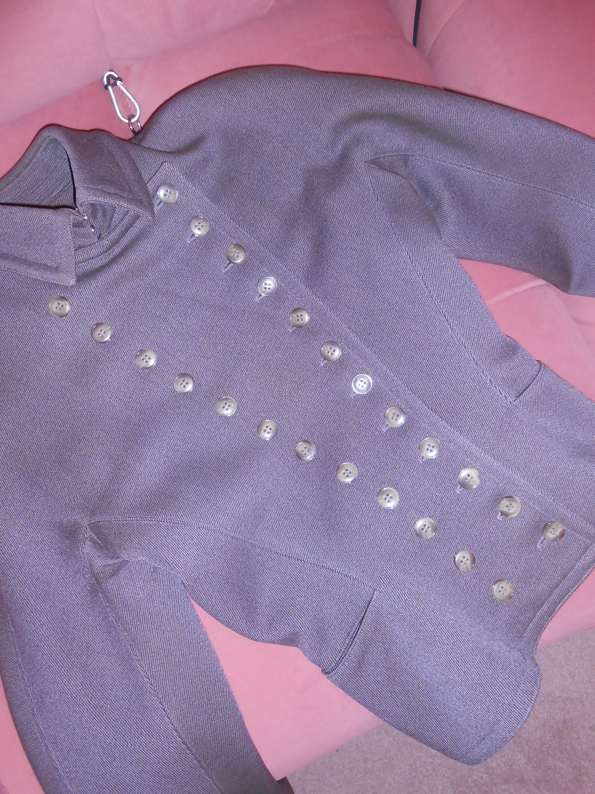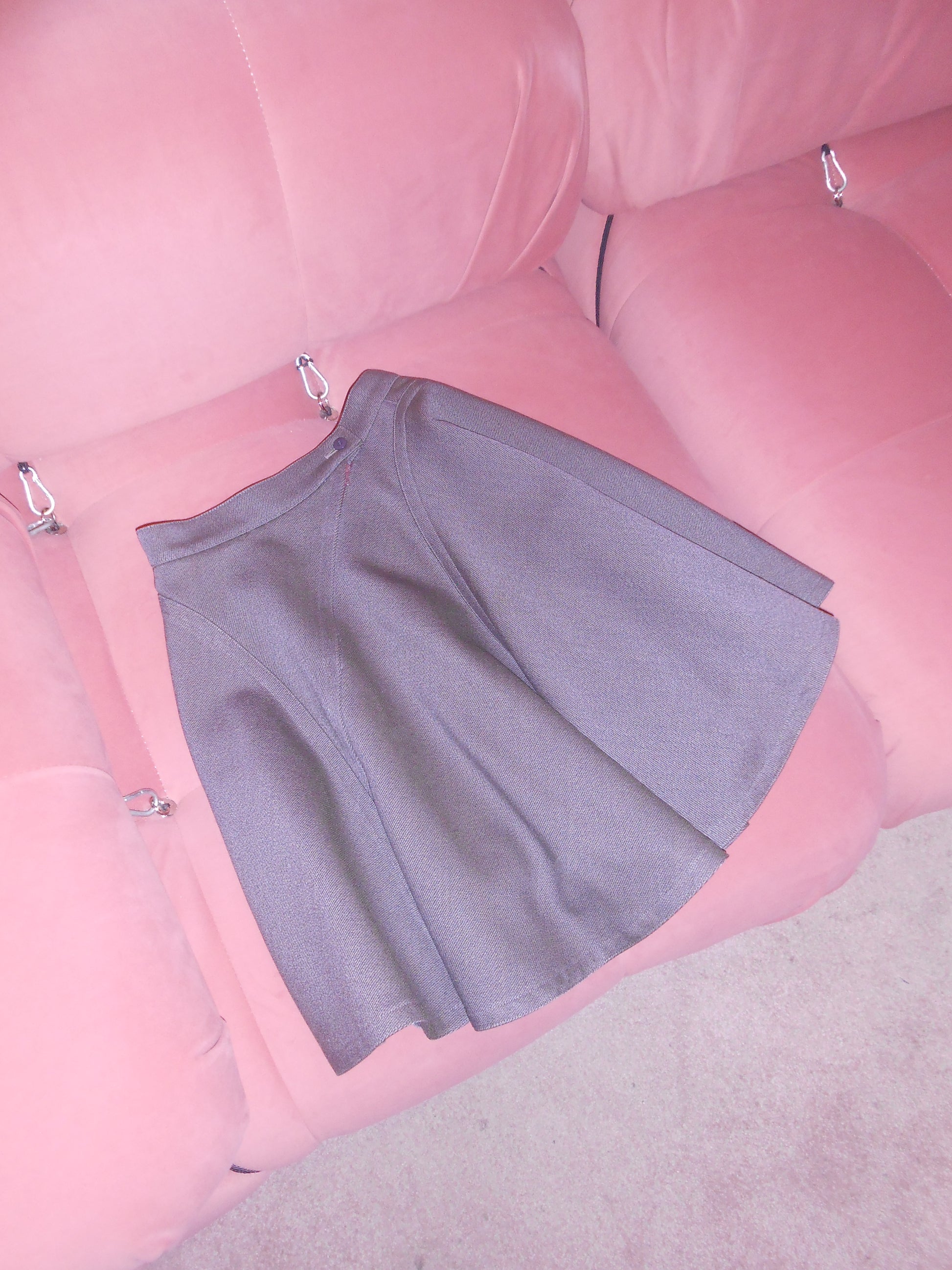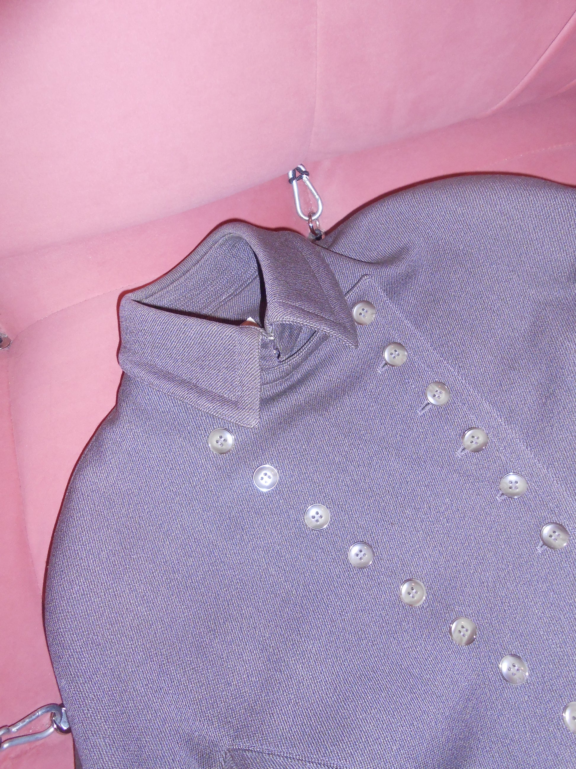 DESCRIPTION : The ever iconic military style structured jacket & skirt set from Alaia's FW 1987 runway collection. Done in a rich wool, the jacket has gorgeous standalone structure with balloon sleeves and a high collar. Two columns of buttons stitched up the front of the jacket creating a beautiful line on the wearer. The high collar clips shut with 2 hook-and-eyes and finishes off the jacket perfectly. This set also includes the matching skirt, also seen on the runway. It's a circle skirt silhouette, with a high-waisted fit and full structure. This jacket style was seen in various versions on the runway and in the editorials of the respective season.