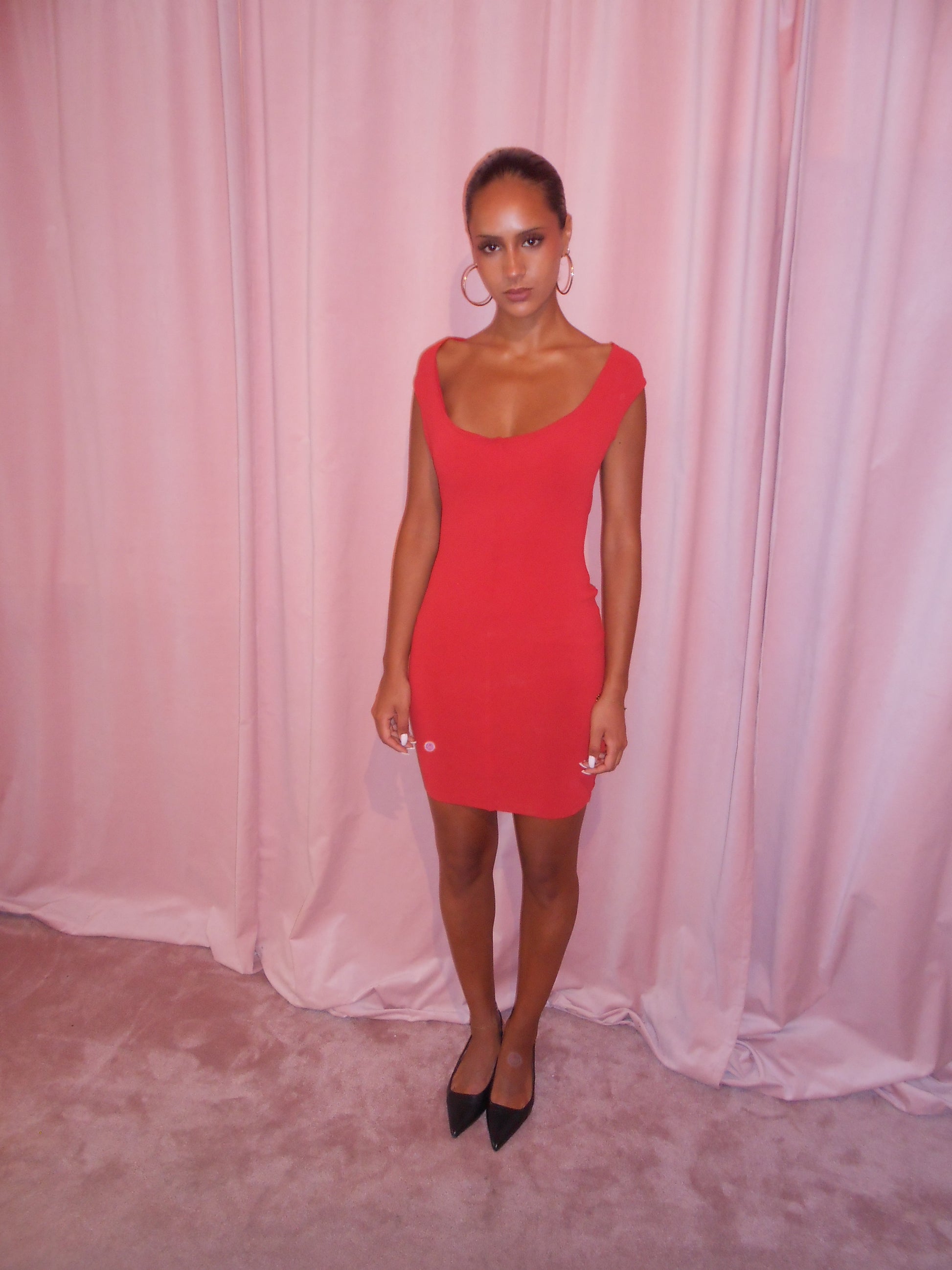 DESCRIPTION : A fabulous fitted mini dress from Alaia's SS 1989 collection. The dress hangs off the shoulders when worn and scoops low on the neckline. The back has a T-strap silhouette with cutouts.