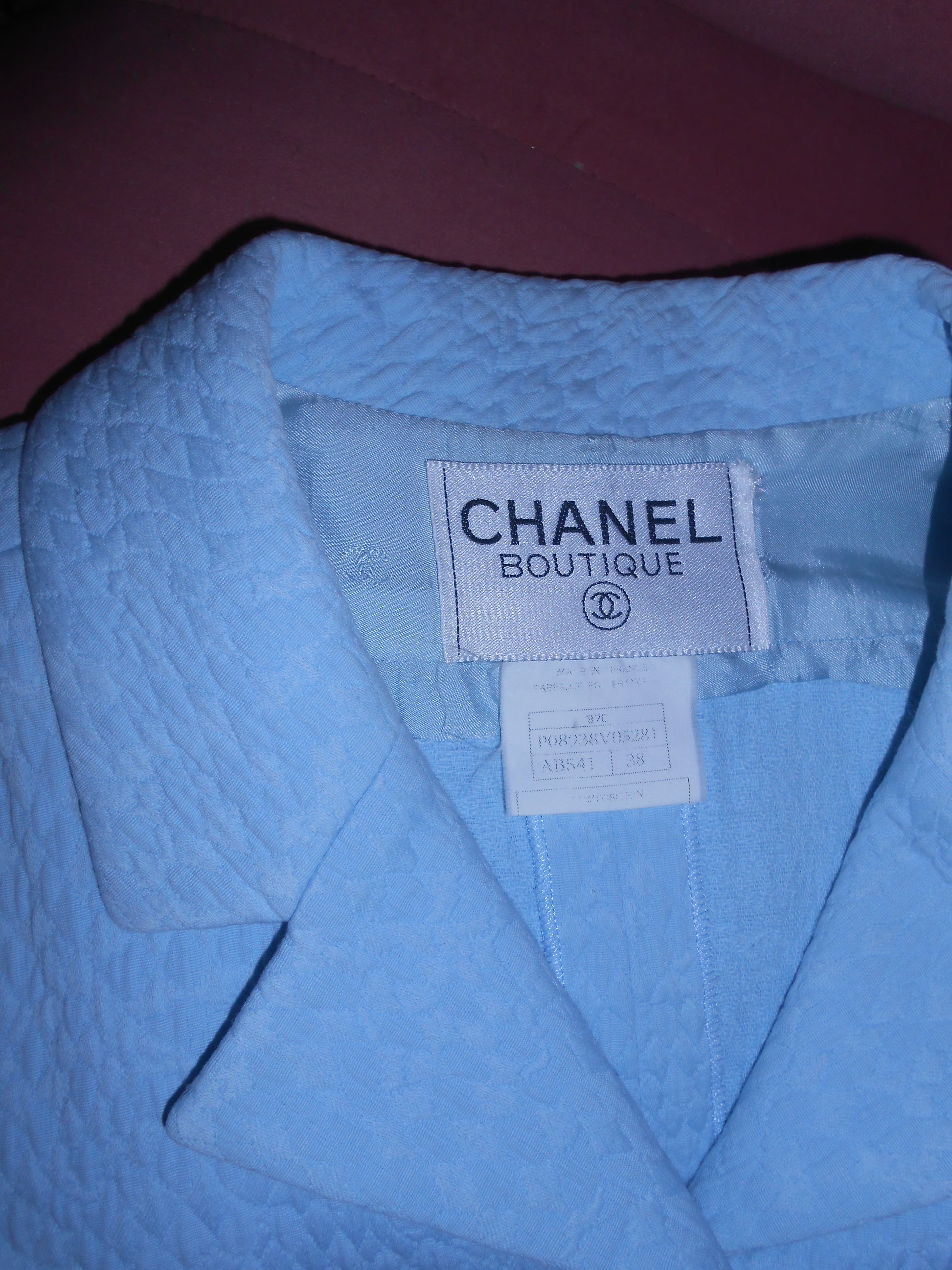 DESCRIPTION : A very sweet short sleeve jacket from Chanel's Cruise 1997 collection. Featuring cap sleeves and four pockets at the front. Fitted silhouette with four CC blue & silver buttons. Can be styled as a jacket or a fitted little top.