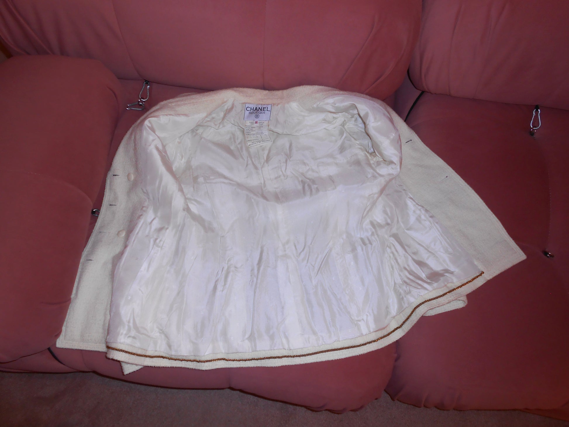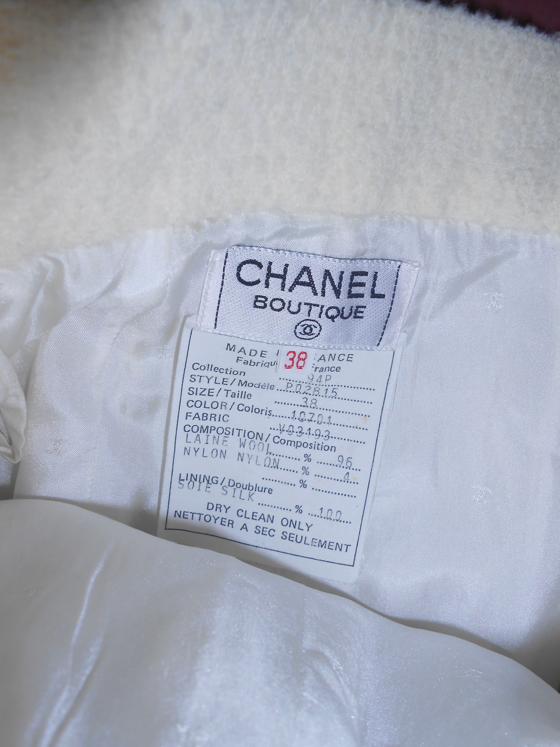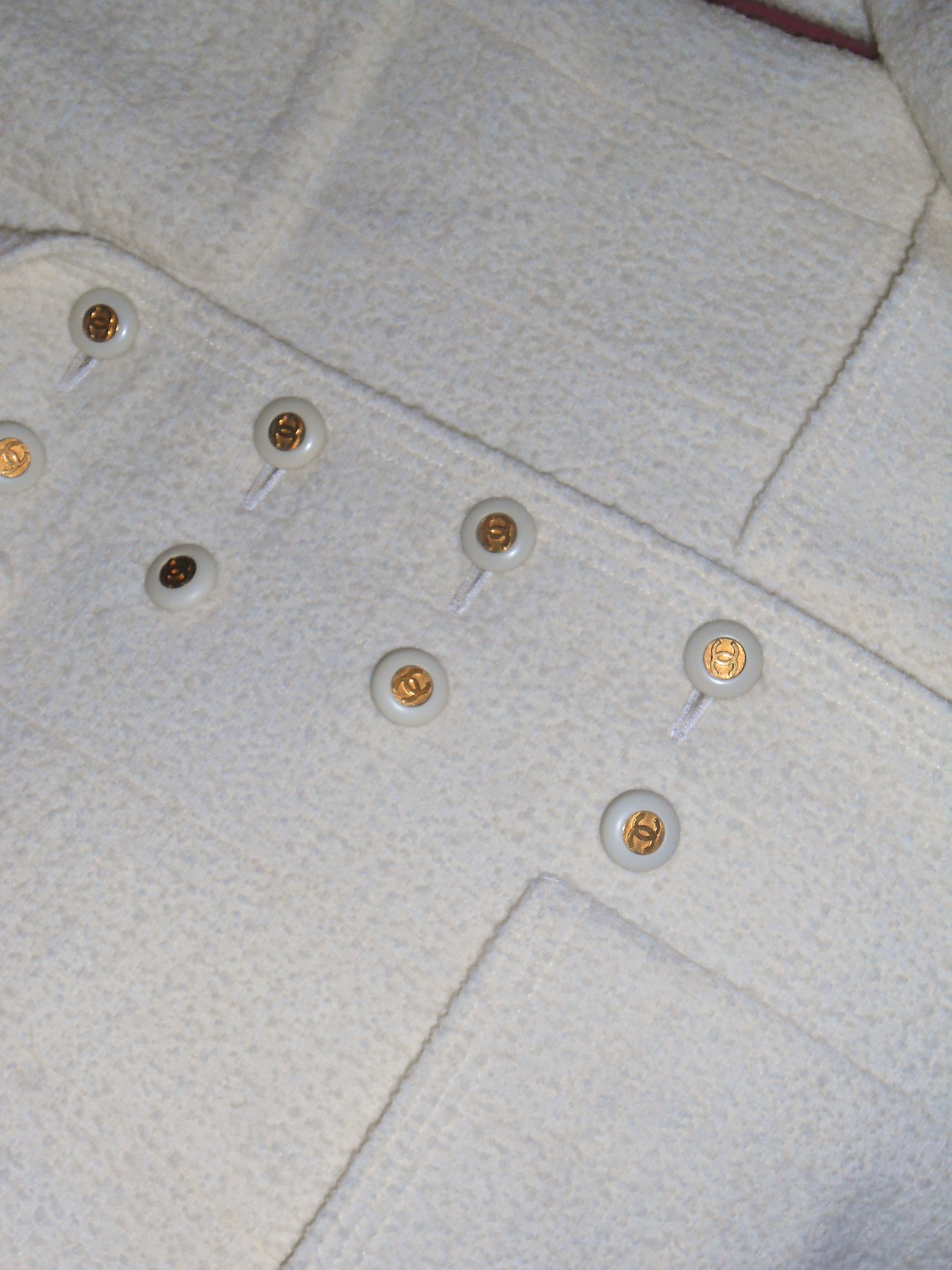 DESCRIPTION : A very chic skirt suit from Chanel's SS 1994 runway collection designed by Karl Lagerfeld. The set features a gorgeous double breasted jacket and mini skirt. Both pieces are done in a beautiful wool bouclette. The jacket features rounded shoulders with light padding, double breasted closure with gold & white CC logo buttons. The skirt is high-waisted at hits mid thigh. The jacket was seen on the runway styled with a ribbon tied to close the jacket. The jacket was also seen in the campaign for the SS 1994 season.