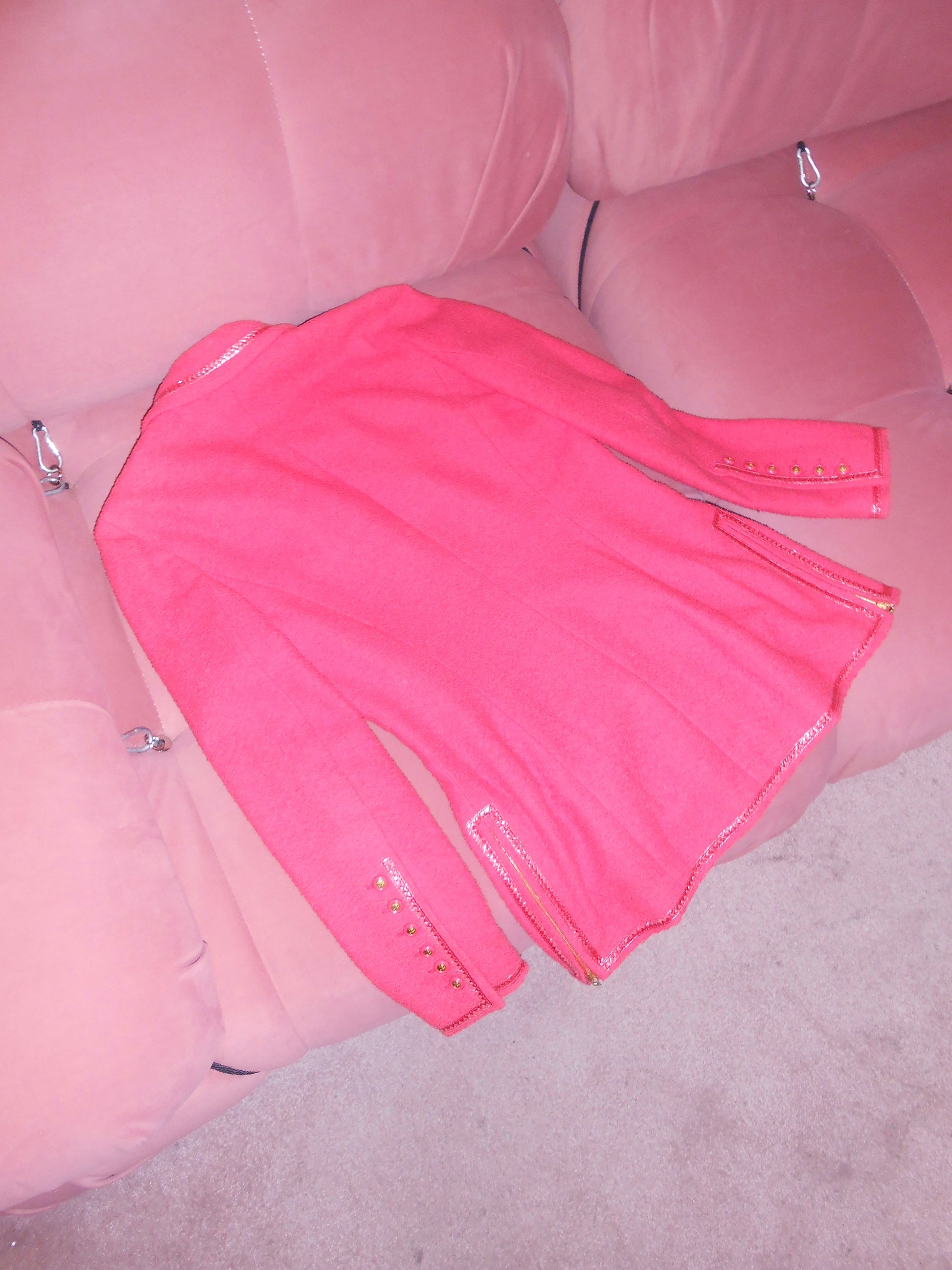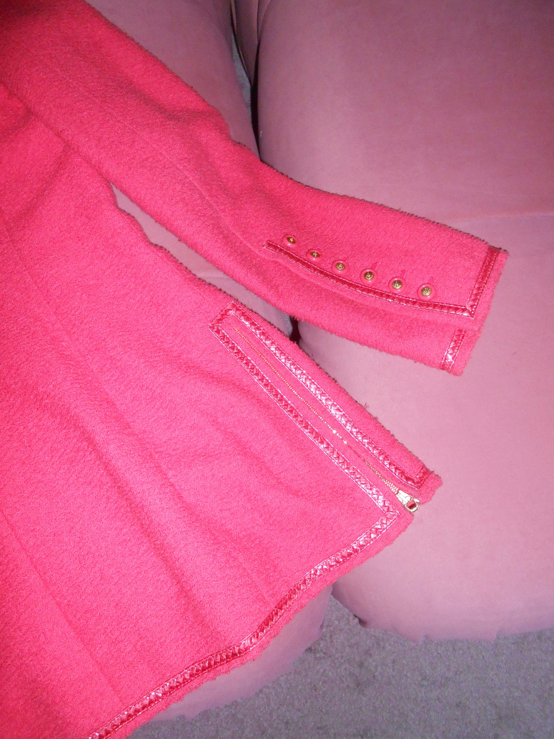 DESCRIPTION : Chanel by Karl Lagerfeld jacket from the ever-iconic SS 1995 Barbie collection. The jacket is in a very pop hot pink wool with gold hardware. Features a zip front closure with a CHANEL zipper pull. Each sleeve has 6 CC logo buttons at the wrist. Patent leather trim throughout perfectly finishes off this stunning jacket. Can be worn zipped up as a top or open as a jacket. Styles perfectly with jeans and a kitten heel ! Truly an iconic pieces for any collector !
