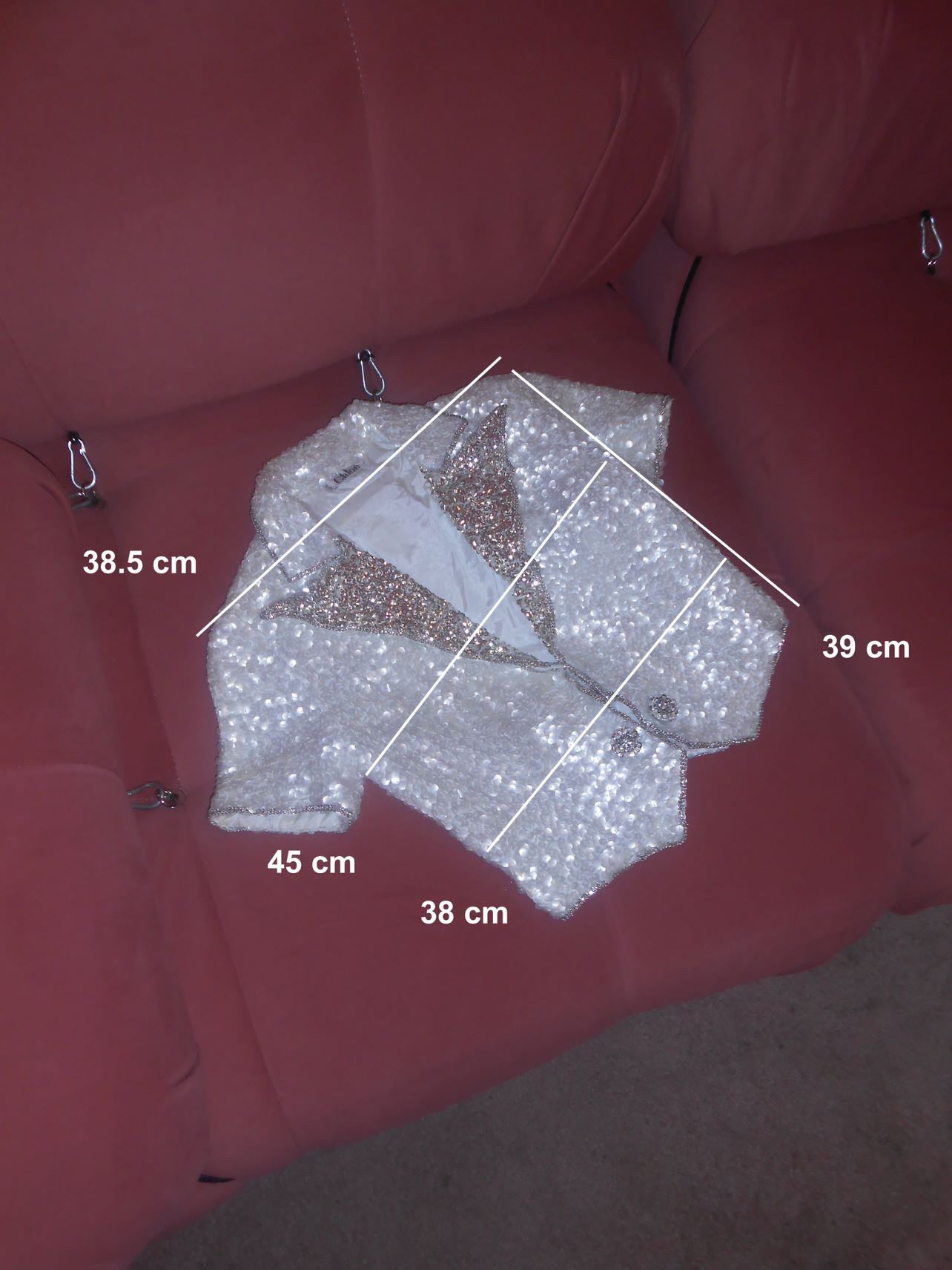 DESCRIPTION : A gorgeous Chloé by Martine Sitbon sequin jacket top. This cropped tuxedo style short sleeve jacket is the perfect festive top for any holiday occasion or bridal event. Covered in white sequins, featuring a silver sequin trim and silver lapels, the jacket closes with two hook & eyes at the front. Two jewel buttons add the perfect finishing touch.