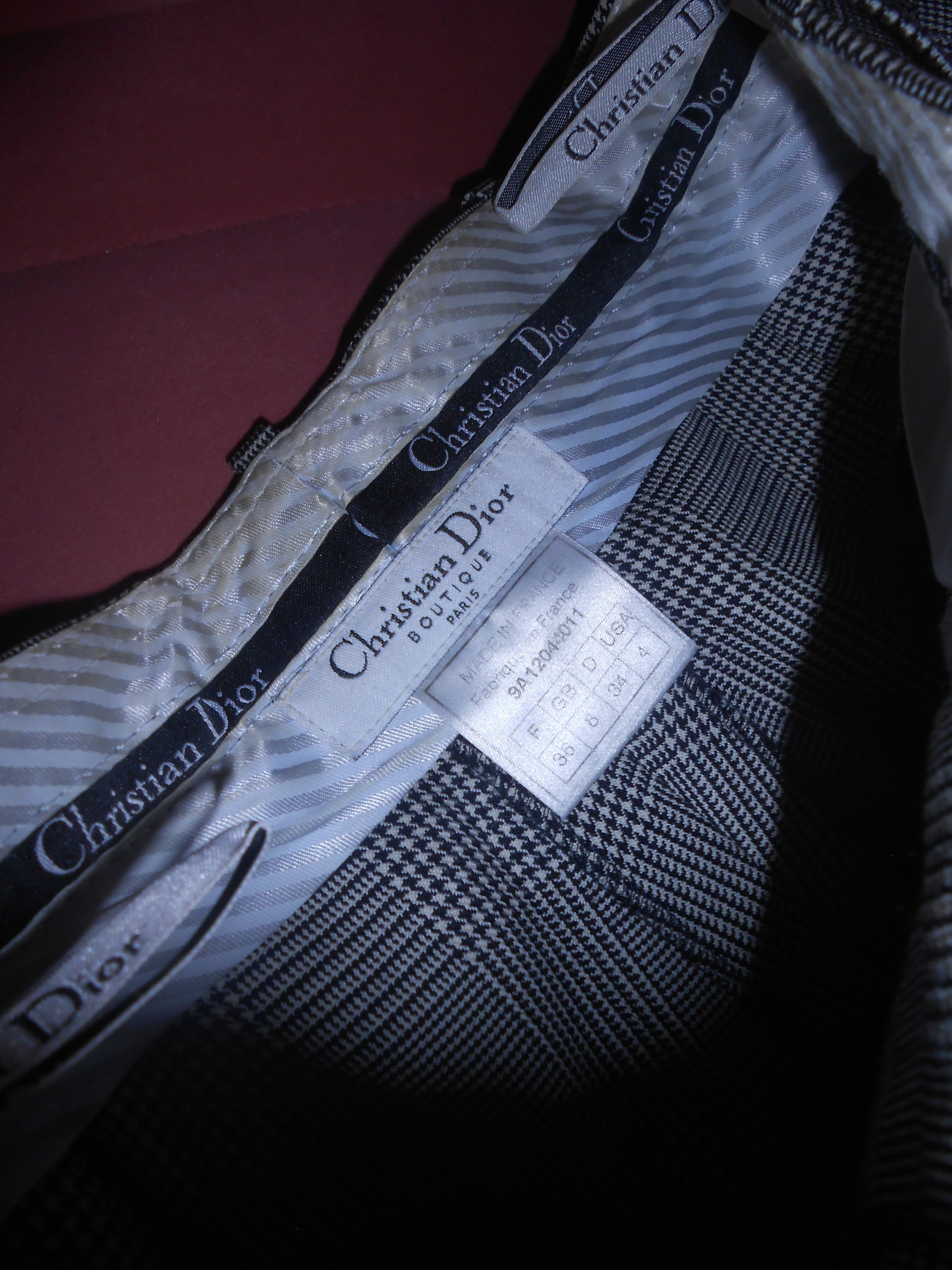 DESCRIPTION : A gorgeous wool suit from Dior's FW 1999 collection by John Galliano. This beautiful Prince of Wales plaid tissue was seen in a few major looks on the runway. This suit rendition is beyond chic, featuring a single button fitted jacket, and high waisted trousers. The jacket has a beautiful lace pattern printed on to the check tissue. Great for any Dior by Galliano collector.