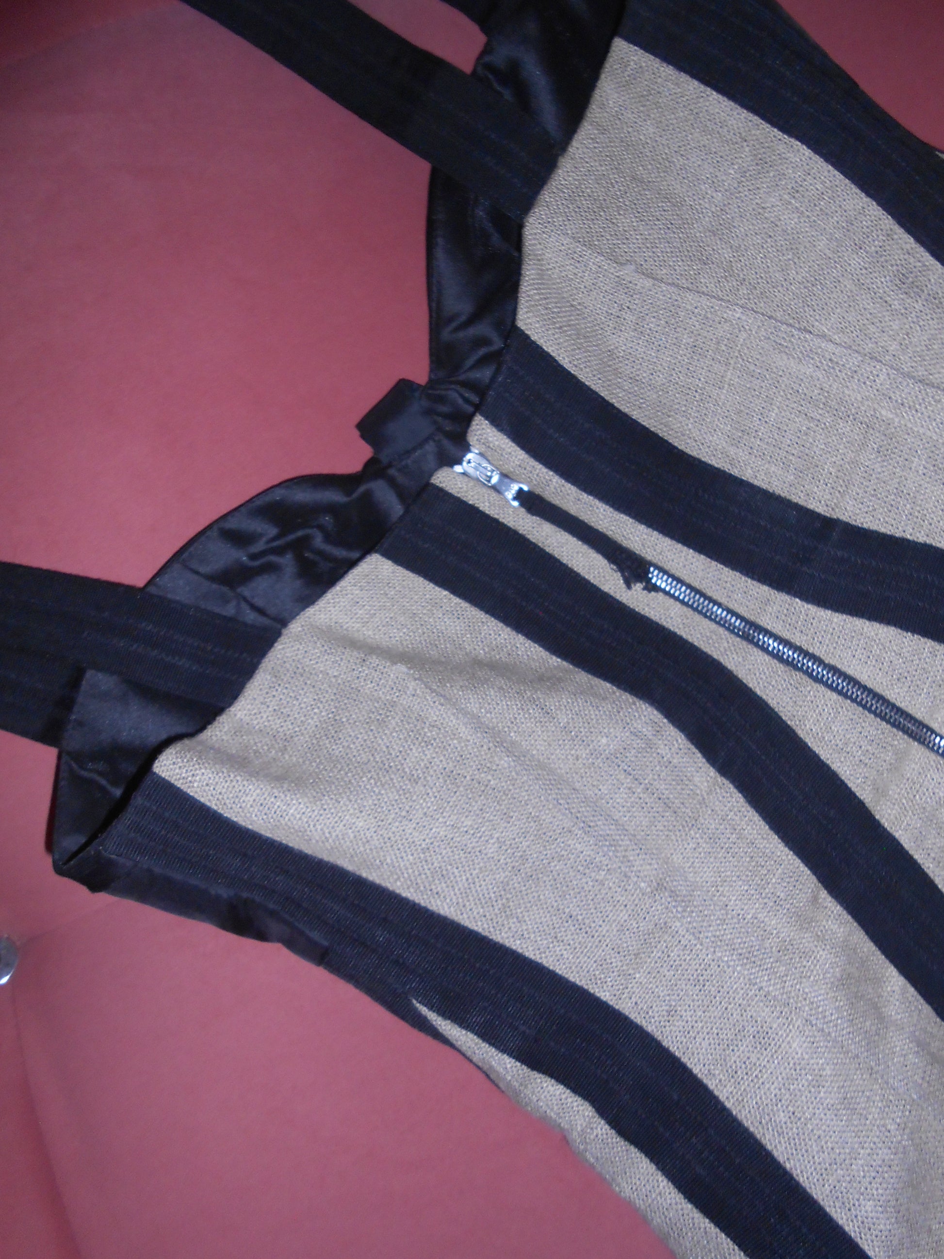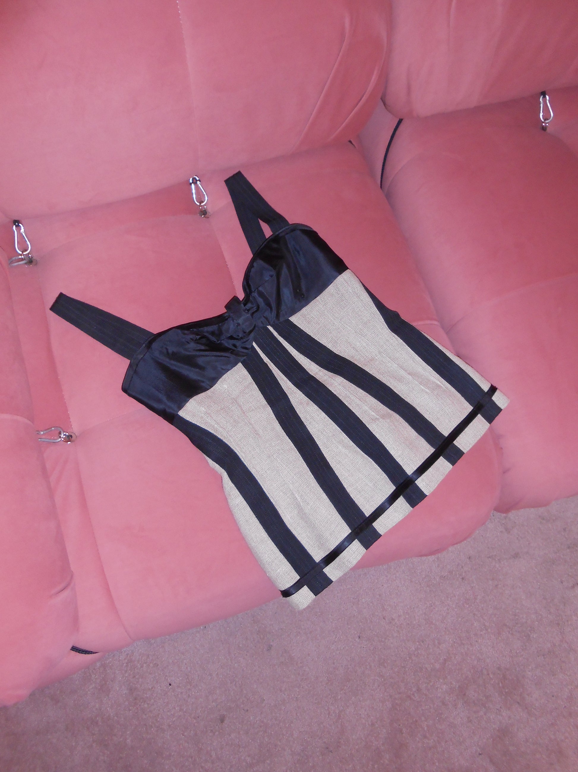 DESCRIPTION : A fun bustier top from D&G, in contrasting burlap and black trim. Exposed zipper closure at the back.