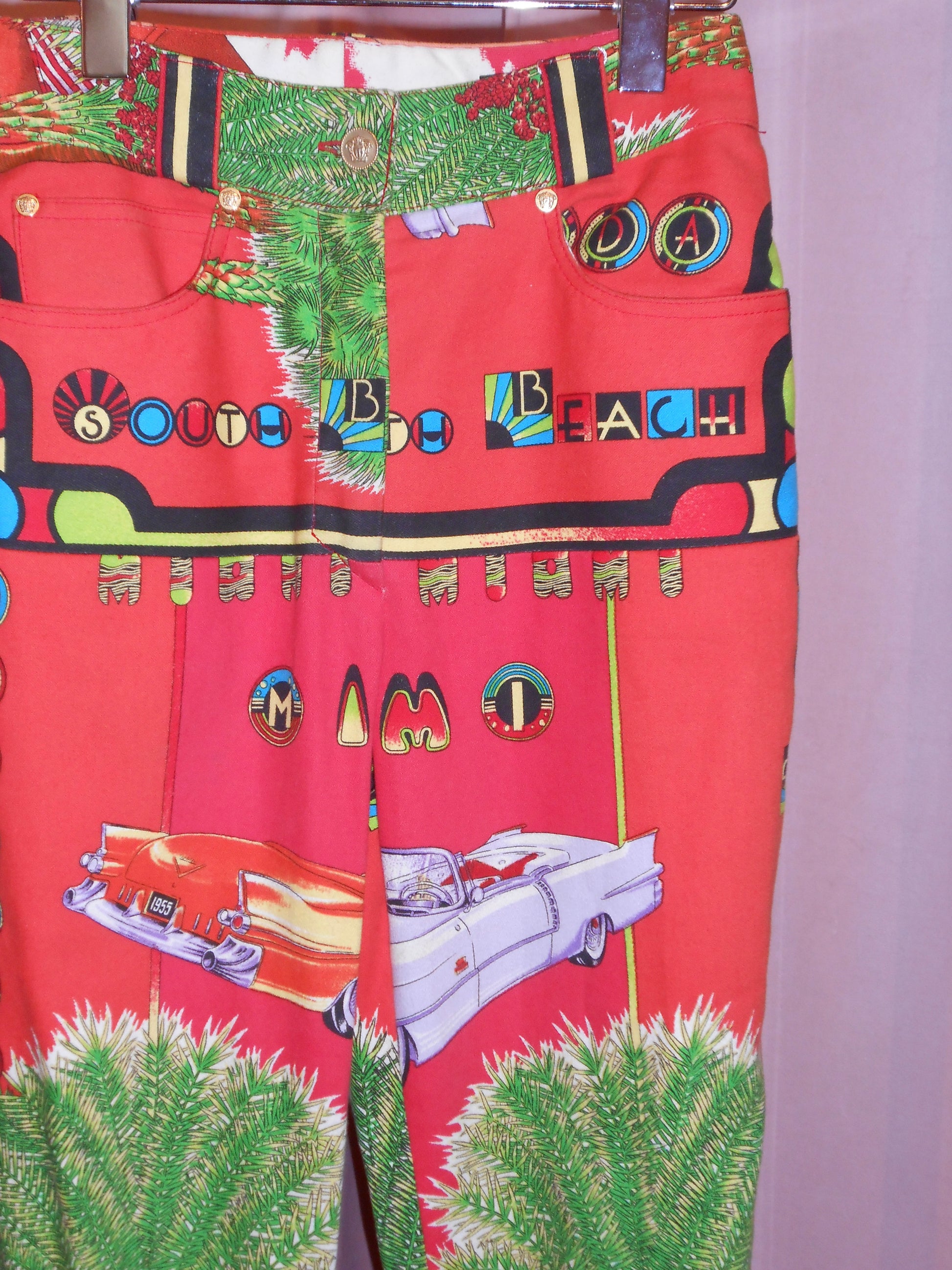 DESCRIPTION : The epitome of Gianni's Versace is Miami style and these cotton jeans at the perfect example of that. 1993's special edition South Beach print was seen in the menswear collections of that year, as well as a few editorial photos from that year. These pants are in a skinny style, with an all-over Miami print. A true Versace collector's item. Very rare.