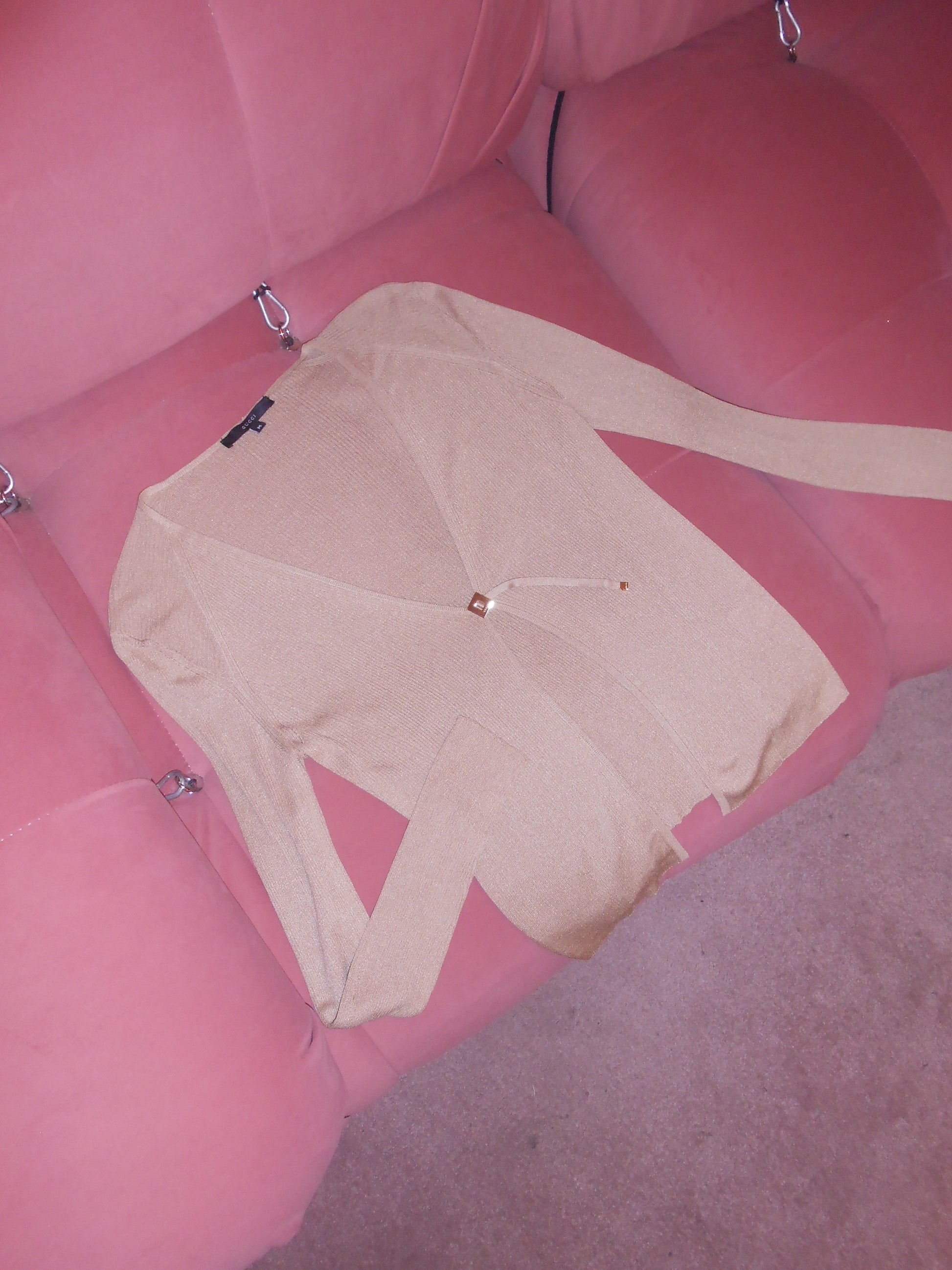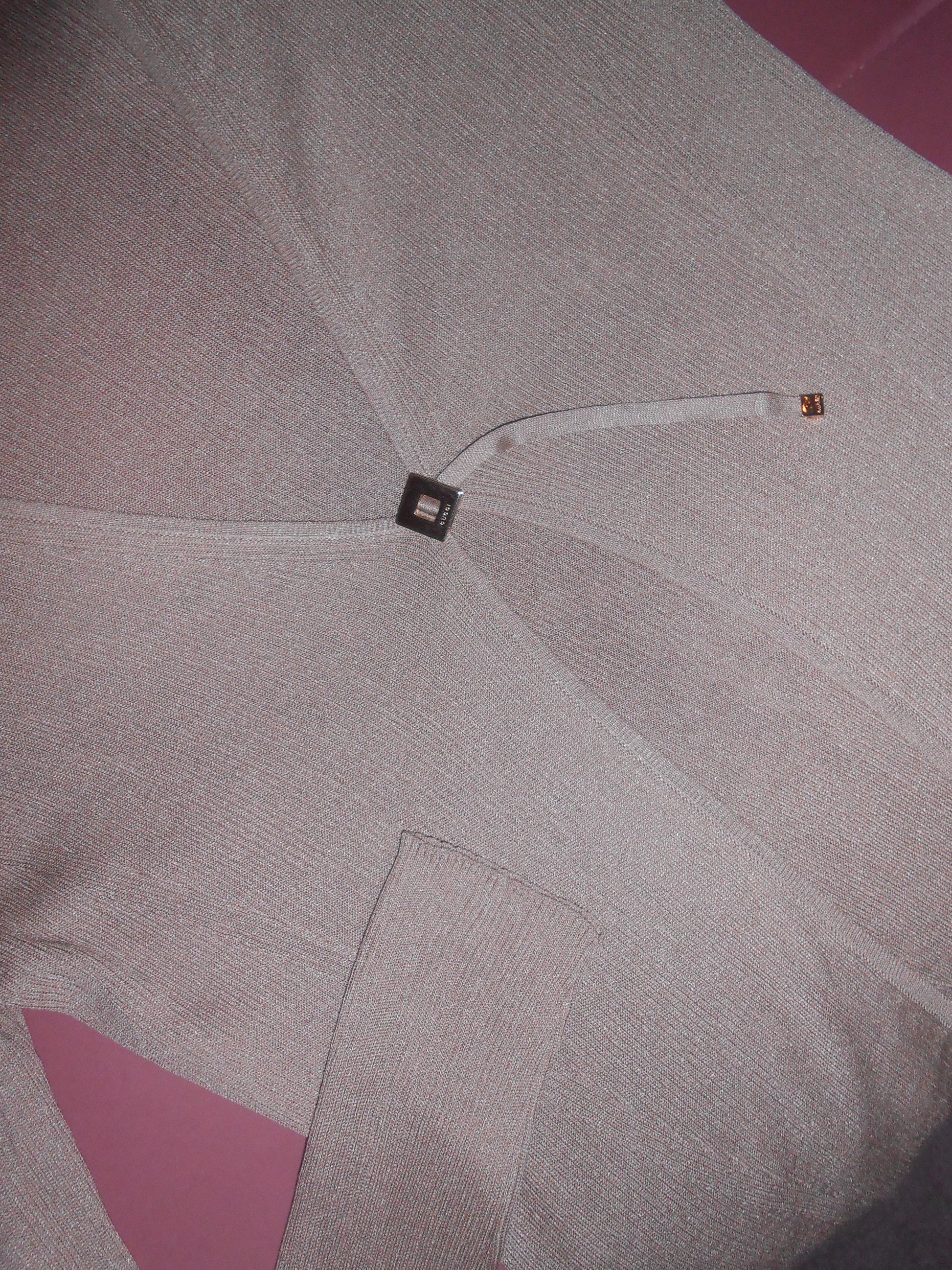 DESCRIPTION : A simple, yet very chic ribbed silk knit top from Gucci's Tom Ford years. Long sleeve, cardigan style top with a gold buckle to tie the top closed.