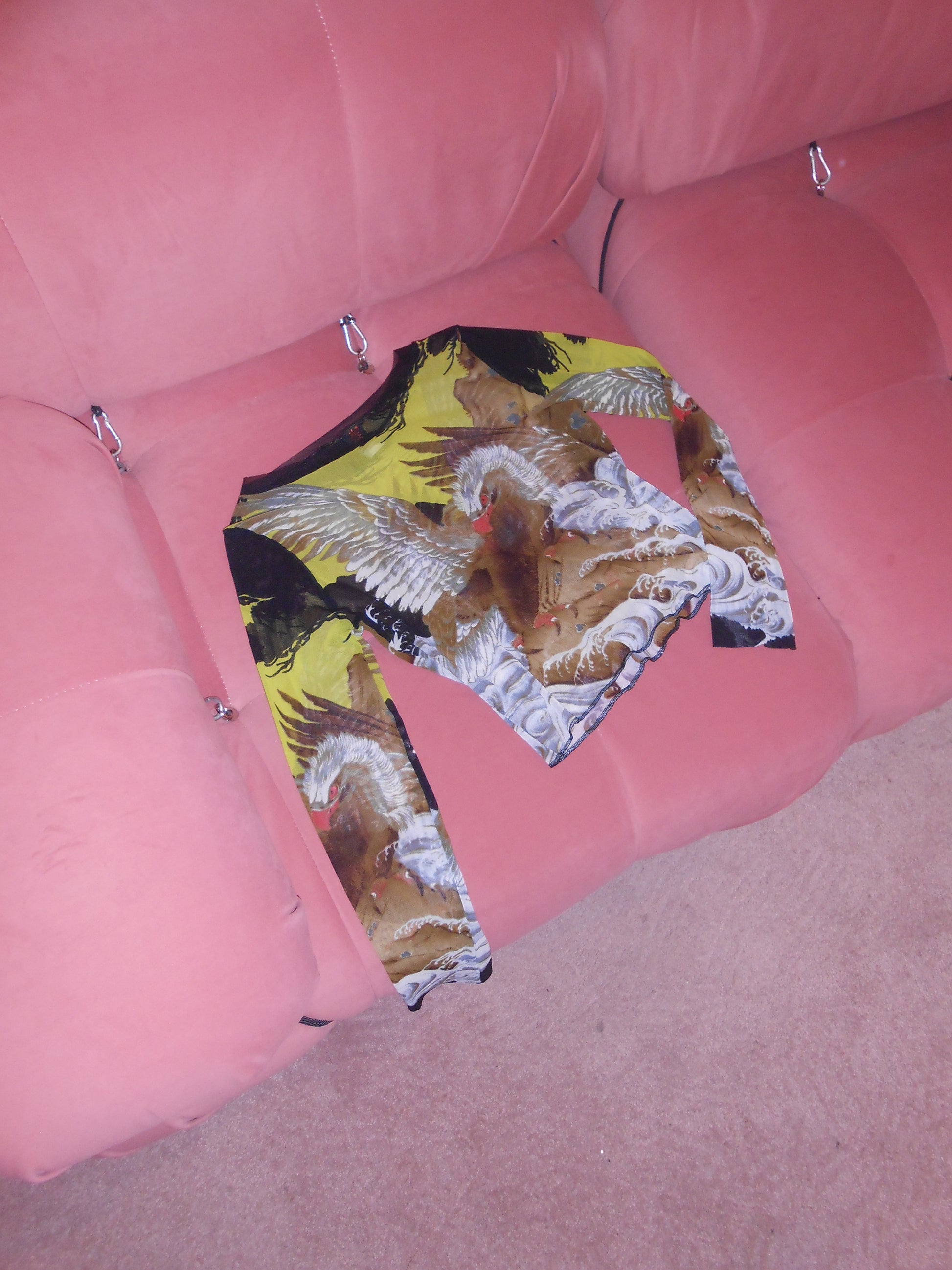 DESCRIPTION : Iconic eagle print mesh top as seen on Kendall Jenner. Sheer thin mesh long sleeve top. Slightly cropped with long sleeves. Has lots of stretch and can fit many sizes.