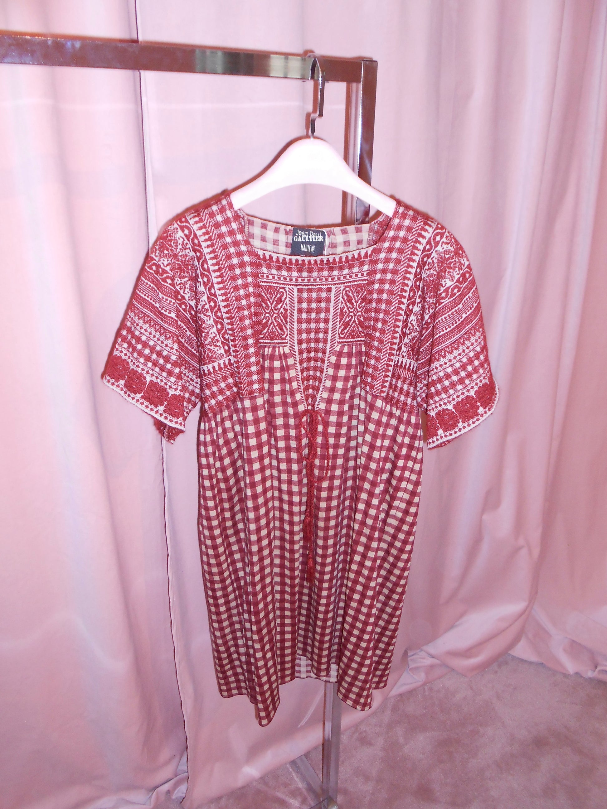 DESCRIPTION : A very sweet wool tunic dress in an allover gingham print, featuring a tie at the front center of the dress. Perfect for the fall / winter season.