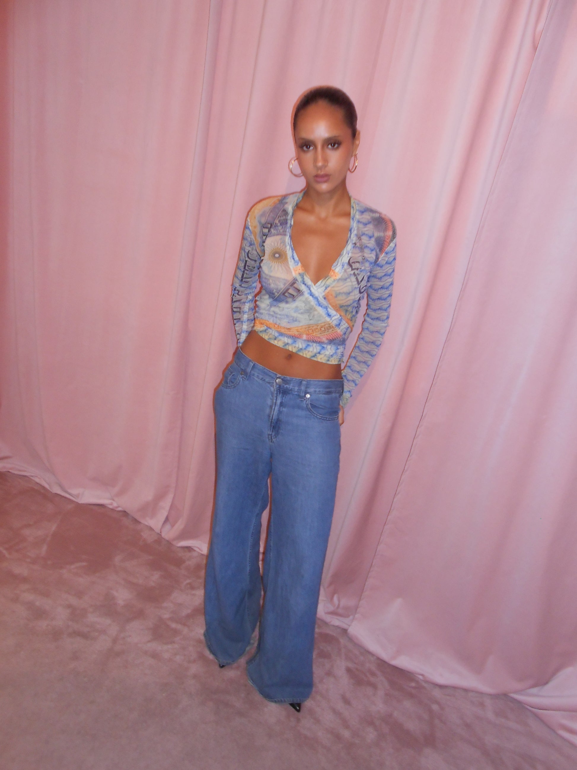 JEAN PAUL GAULTIER SS 1994 SOLEIL CURRENCY PRINT WRAP TOP