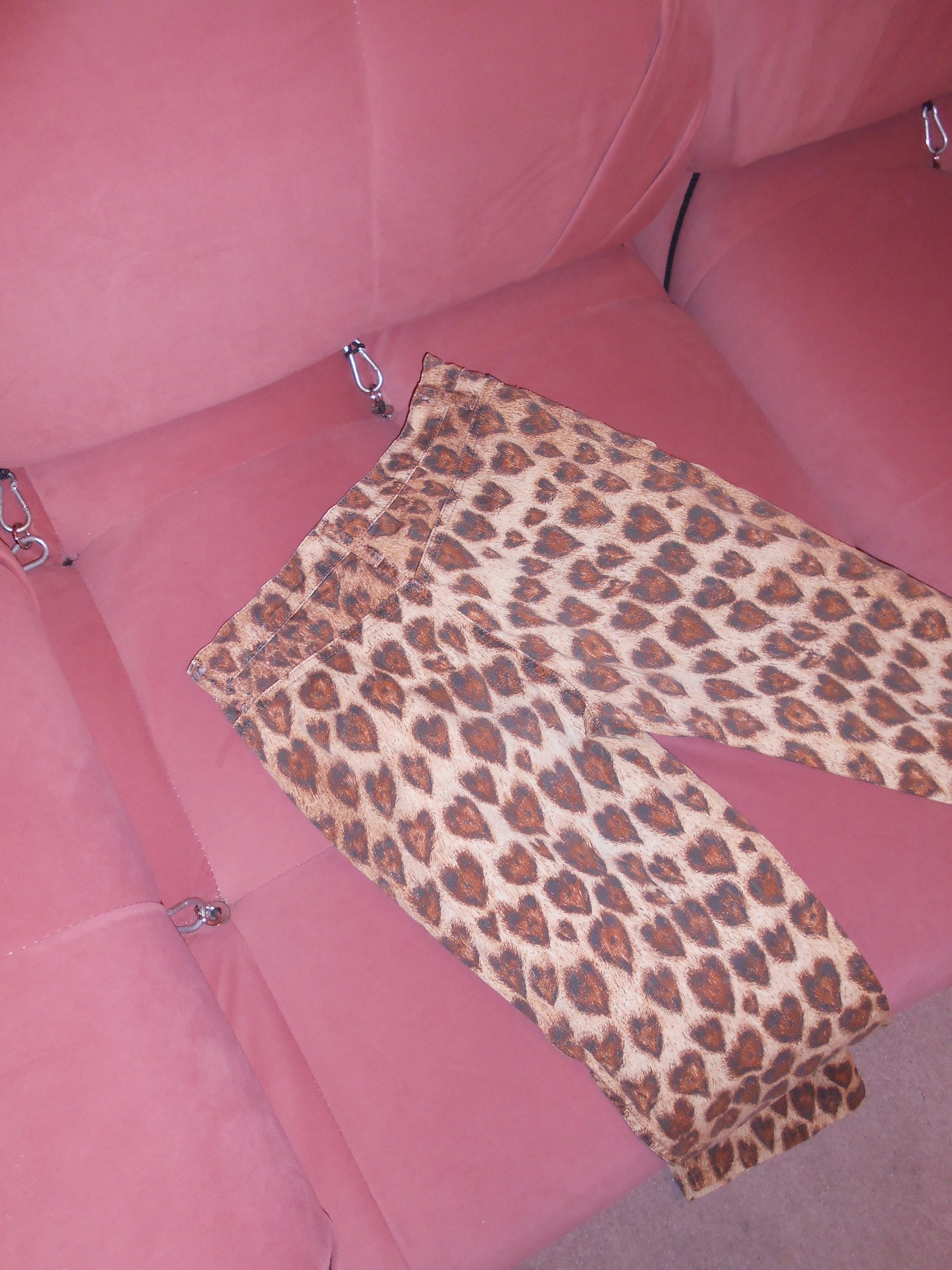 DESCRIPTION : The cutest leopard heart printed pants ! Low waisted with a jean like fit. Soft cotton with a bit of stretch. Pairs perfectly with a baby tee and ballet flats !