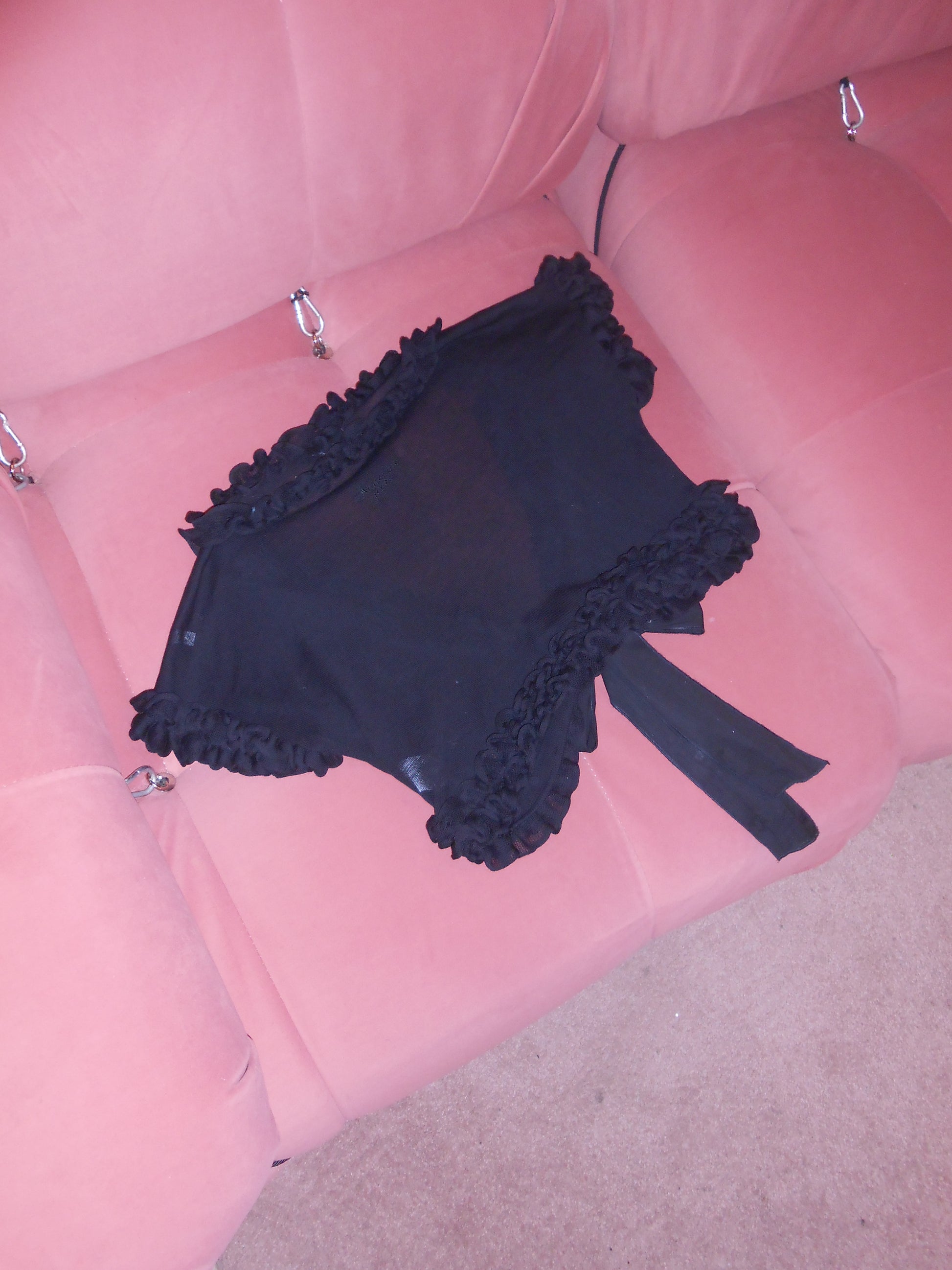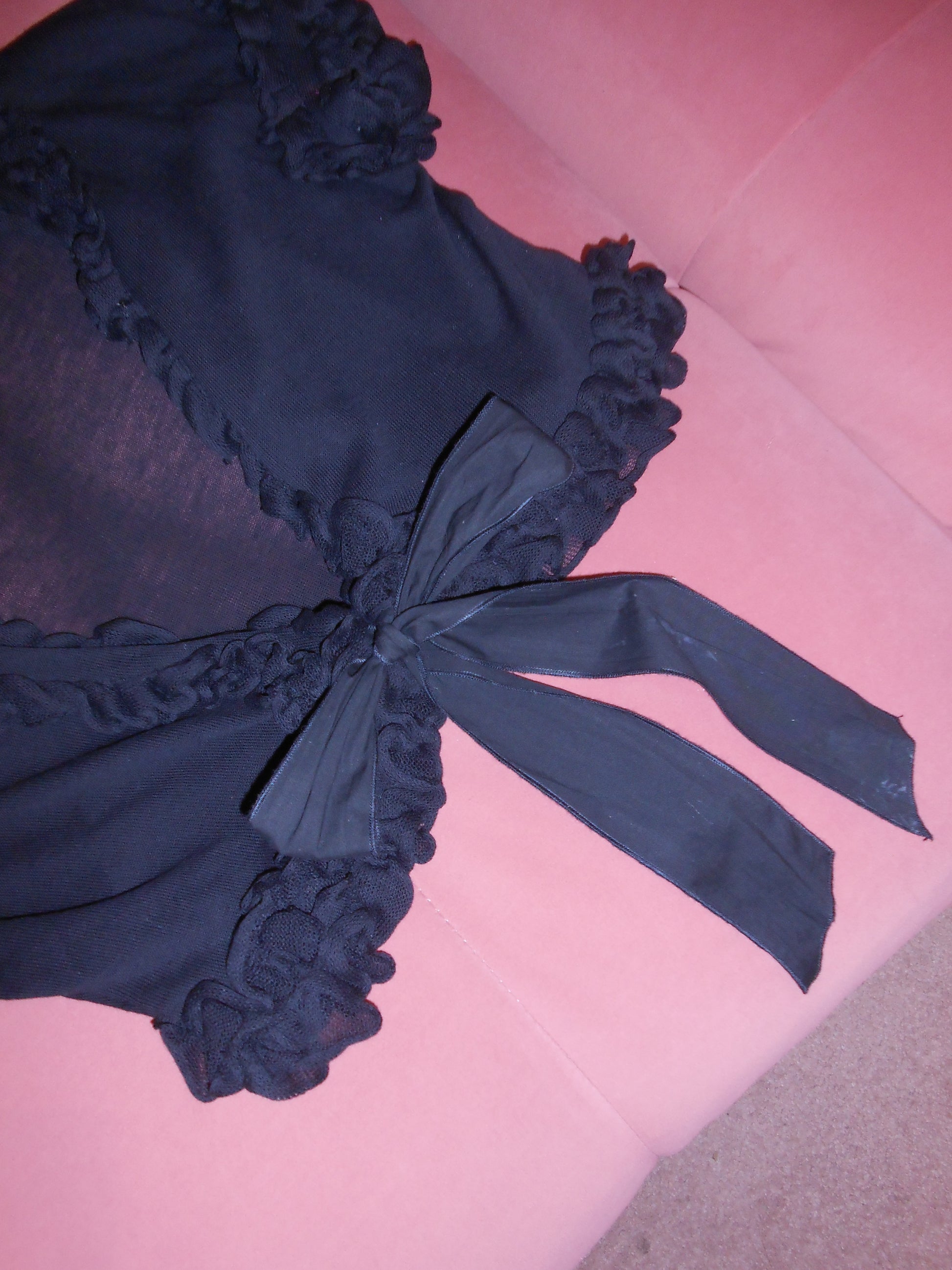 DESCRIPTION : A very fun cropped wrap top with ruffle trim. In a very thin cotton knit. You can tie the top at the center of the chest, like in the photos, or wrap it around your torso. Pairs perfectly with high waisted carpi pants or a billowing summer skirt!