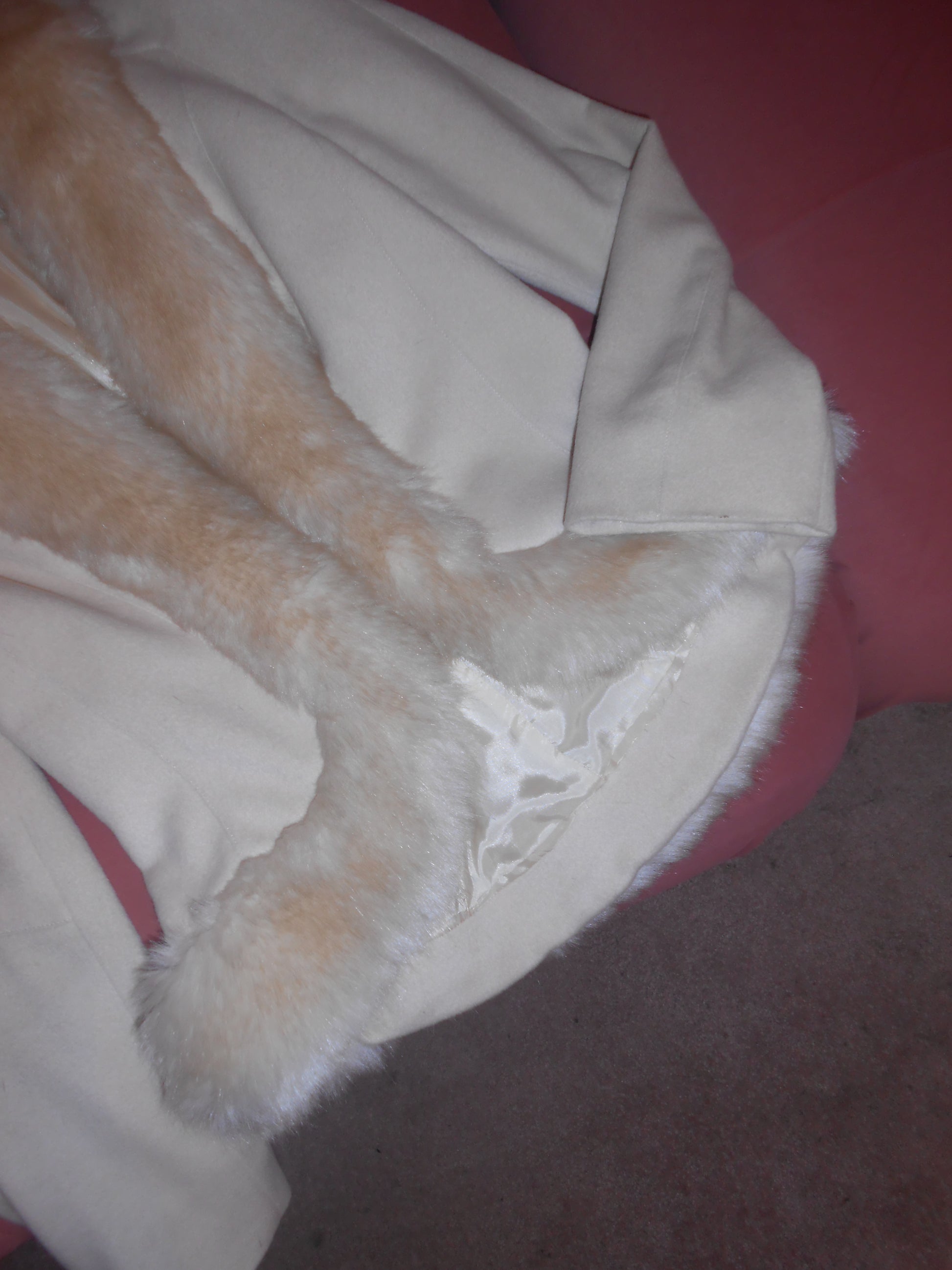 DESCRIPTION : An absolutely fabulous Mugler jacket, featuring a faux fur collar and trim. The ivory wool is soft to the touch and the faux fur trim adds a very chic winter wonderland touch. Just perfect with vintage denim and a heel or dressed up with a mini and fun platforms.