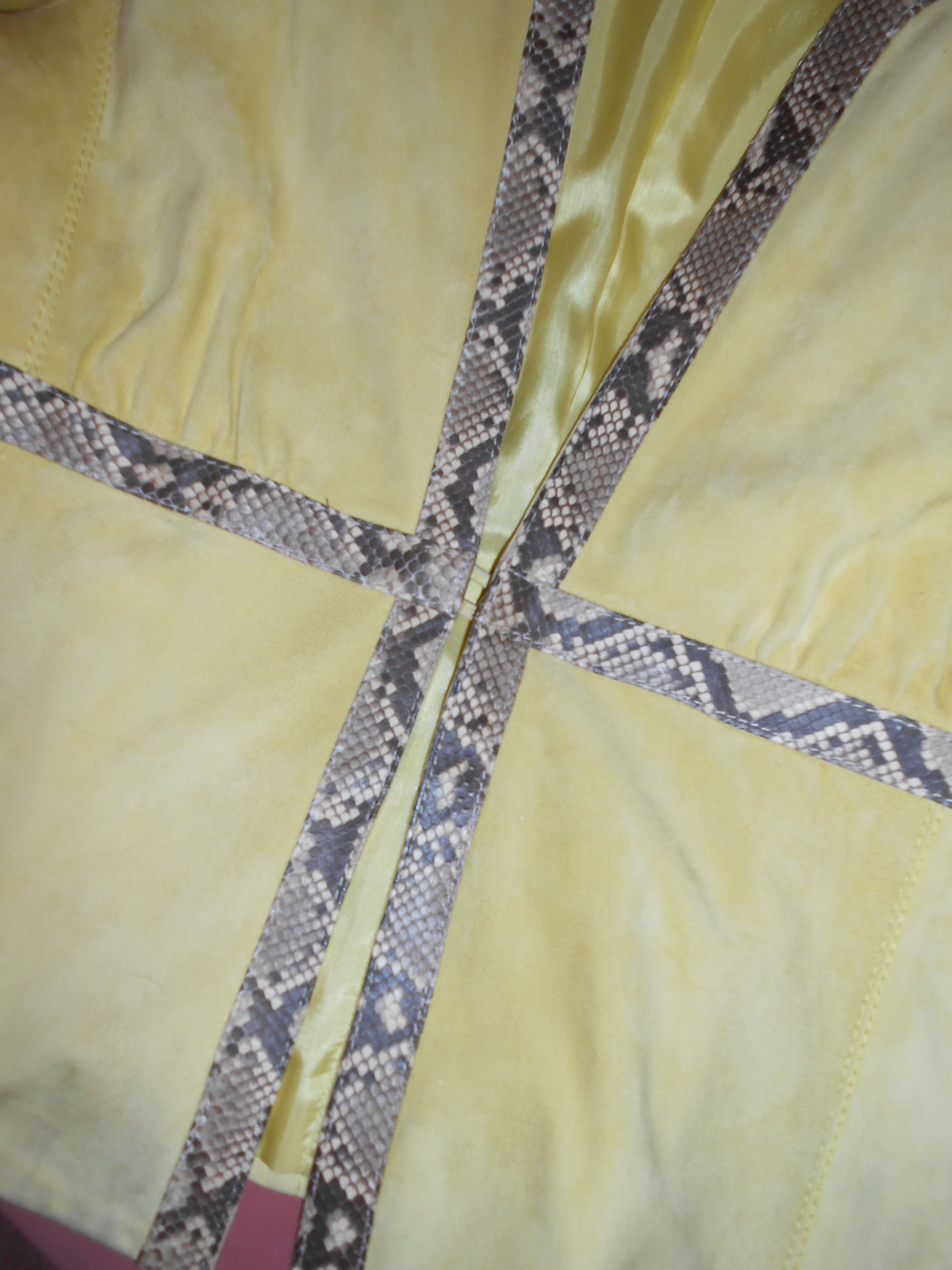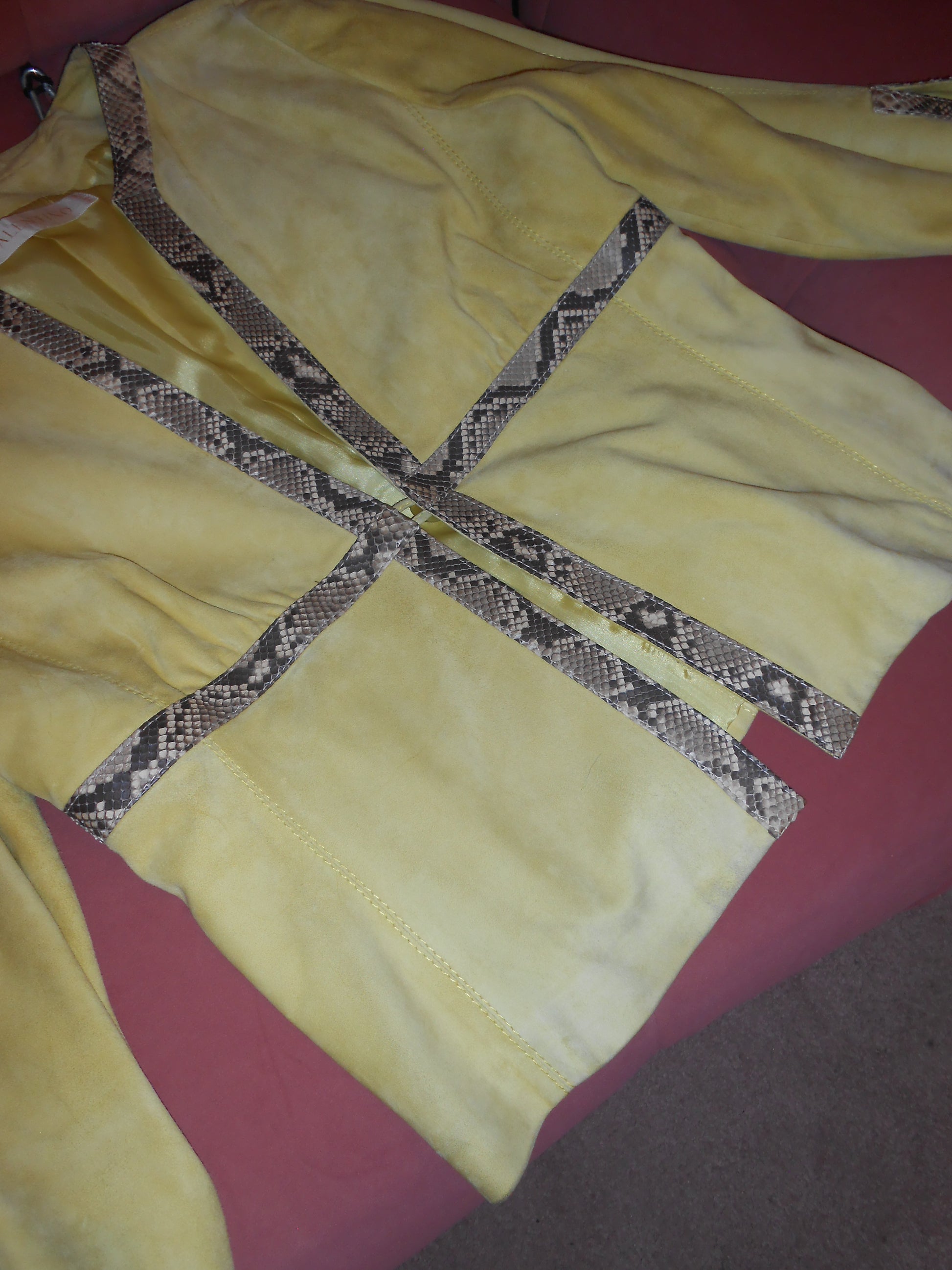 DESCRIPTION : A very cool jacket / top from Valentino. Chartreuse goat suede with python trim. Single button closure at the center of the chest. Cropped sleeves. Can be worn as a jacket or a top. An amazing piece for any Valentino collector !