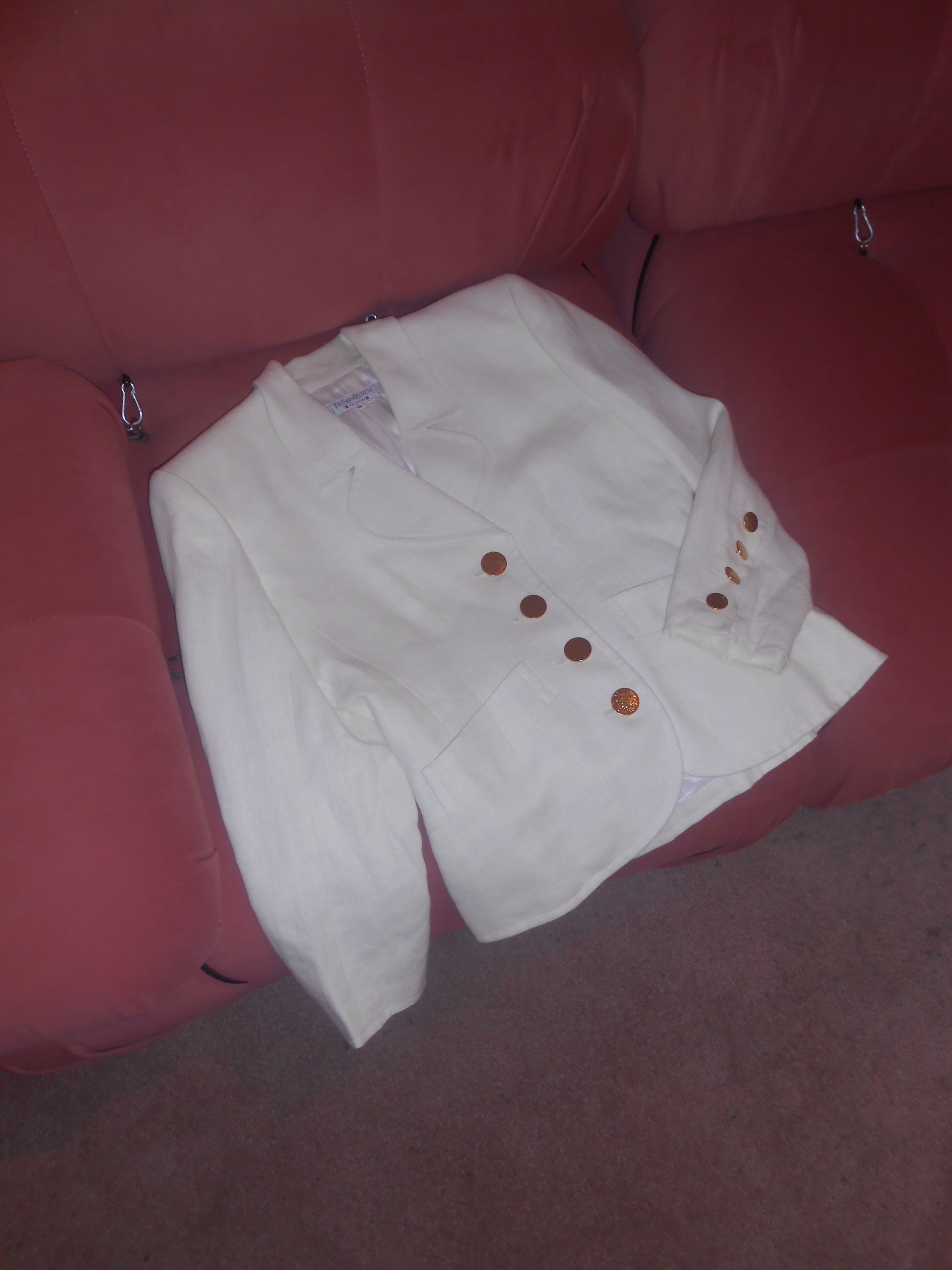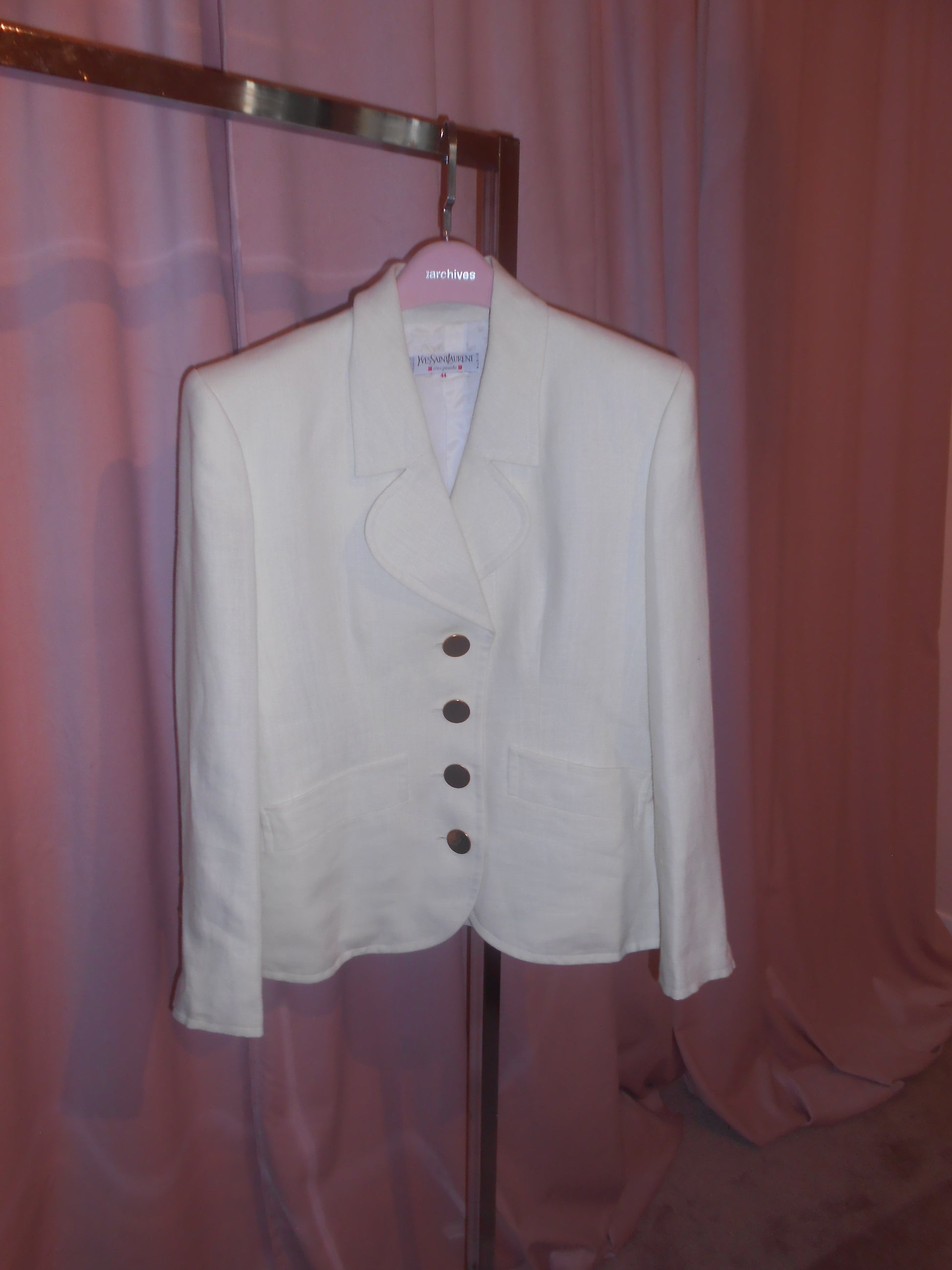 DESCRIPTION : a fabulous & chic linen jacket from YSL's 1990s years. The jacket has structured shoulders and curved lapels. Gold buttons finish off this beautiful jacket. Boxy fit.
