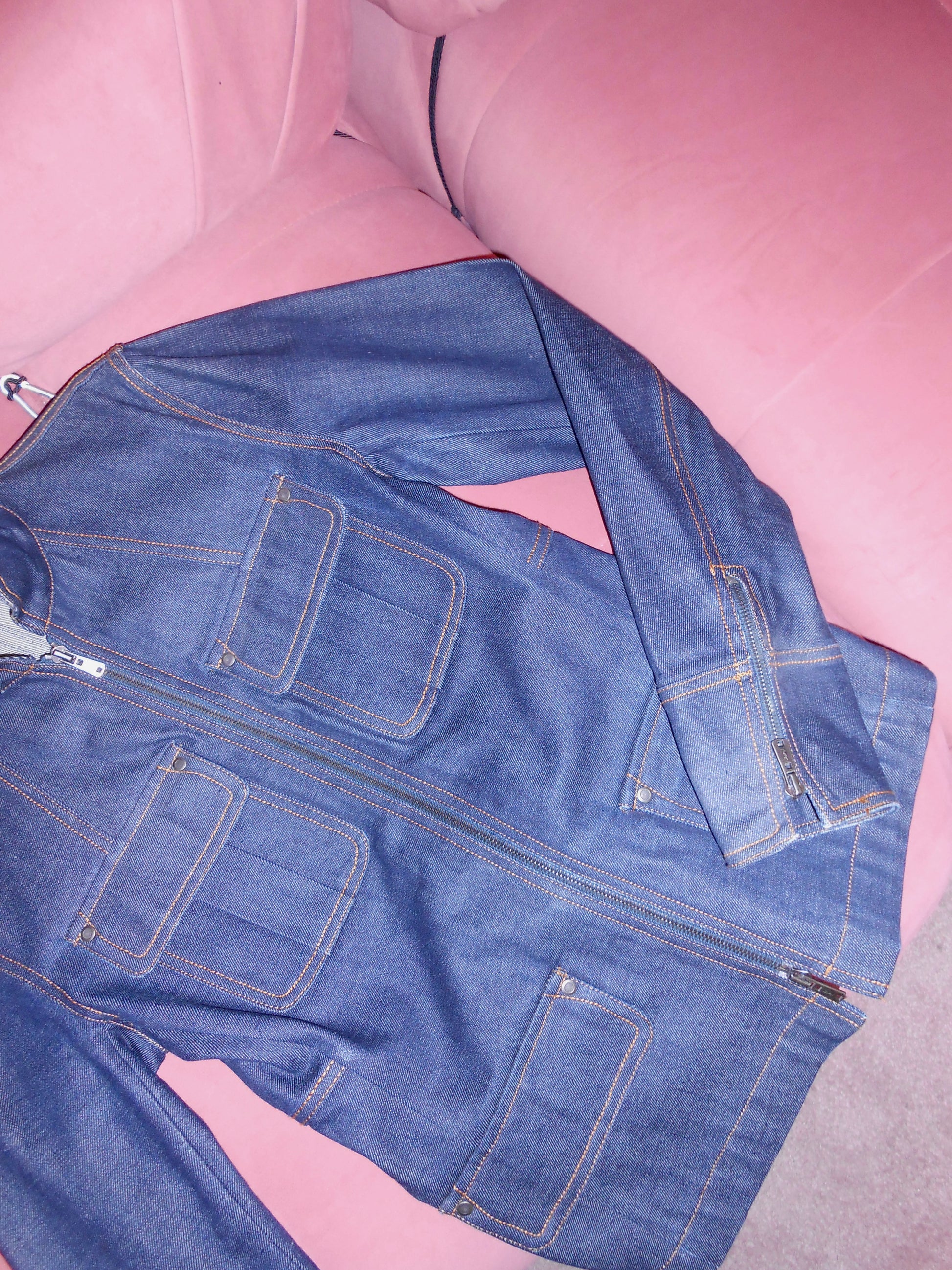 DESCRIPTION : Structured brut denim jacket with contrast stitching. Front zipper and zips at the wrists. High structured collar.