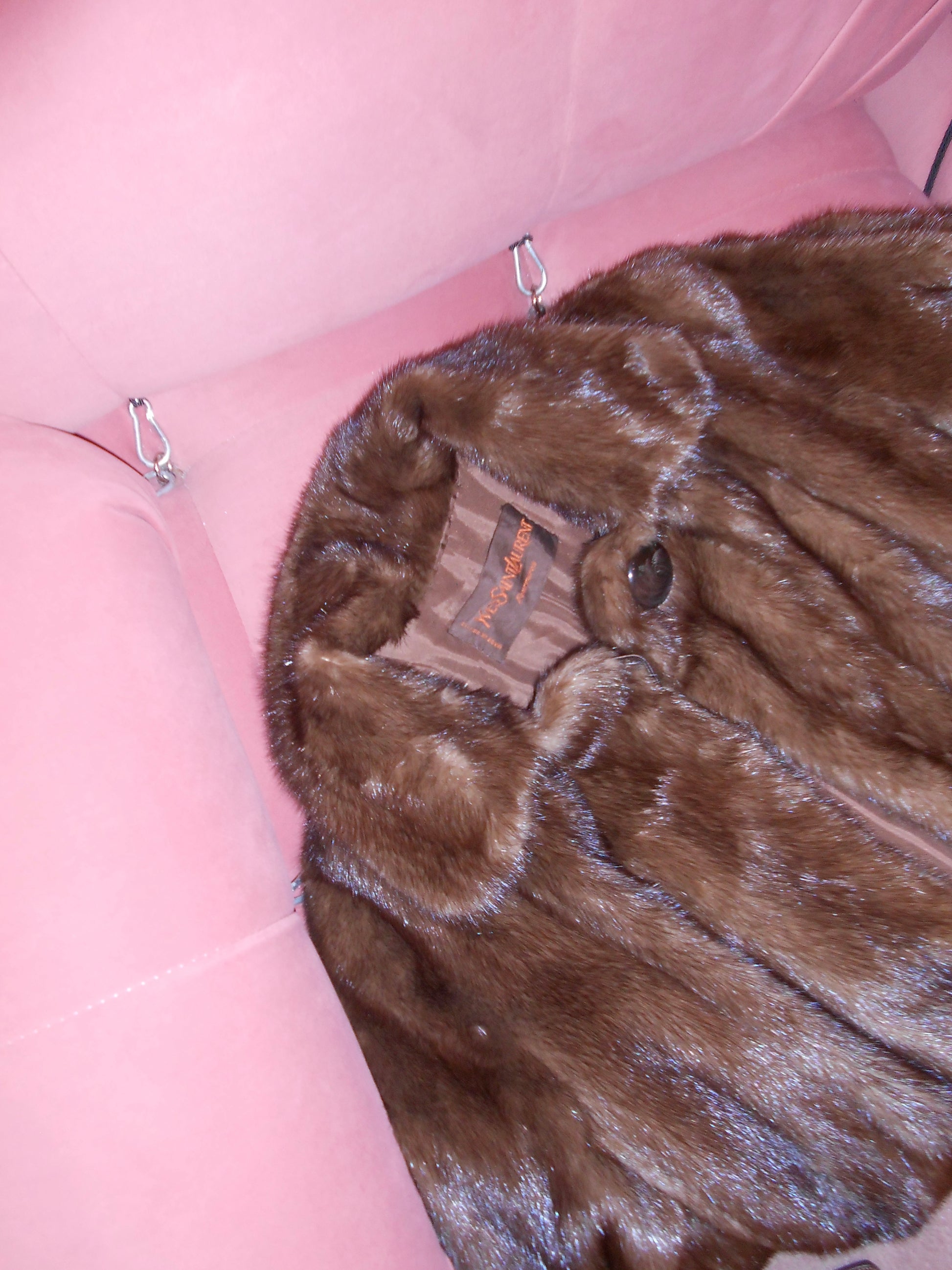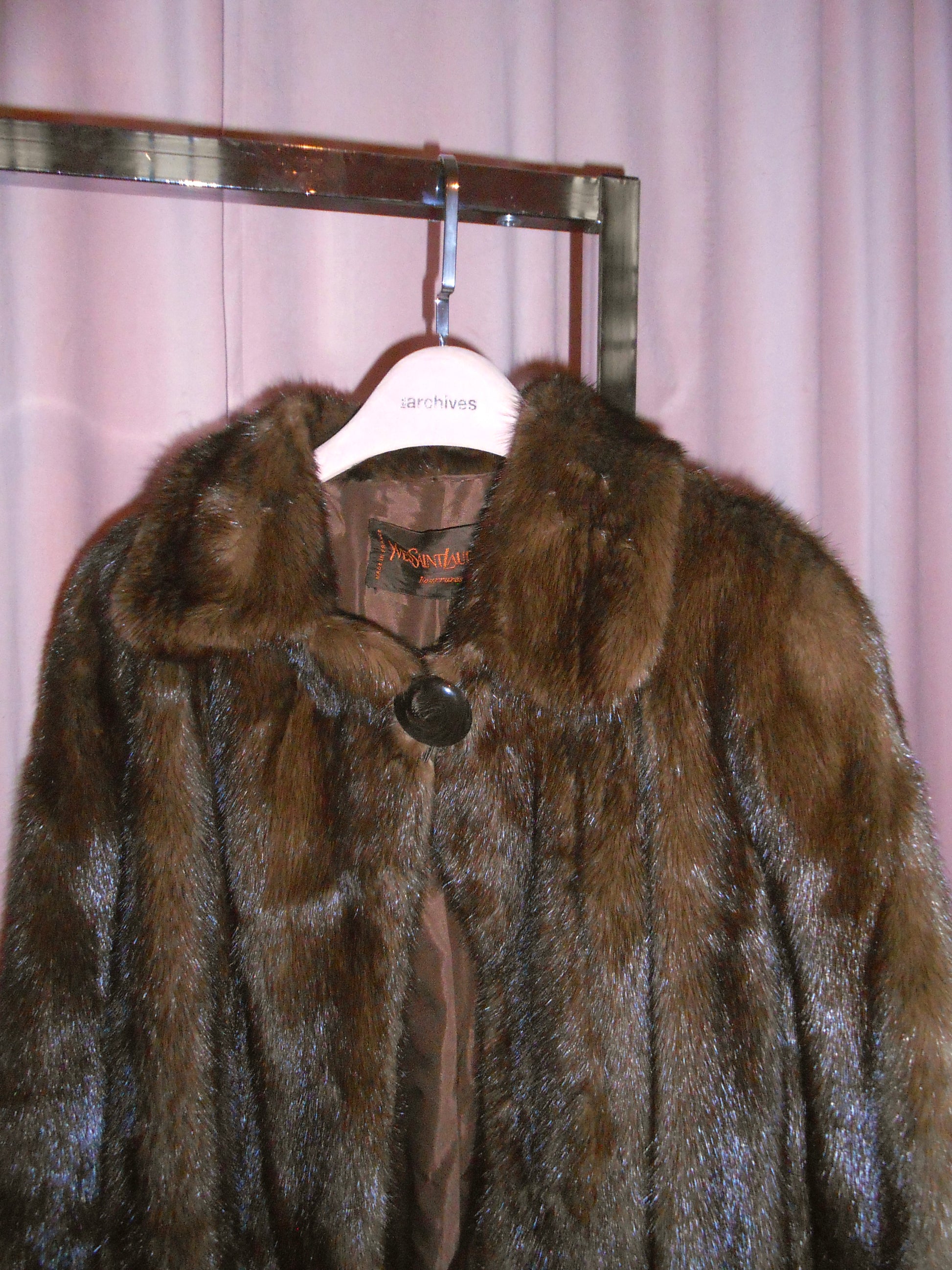 DESCRIPTION : A gorgeous deep brown mink coat by Yves Saint Laurent's fur line. Features a short collar, single button at the neck, and clasps along the length. The coat length hits just below the knee.