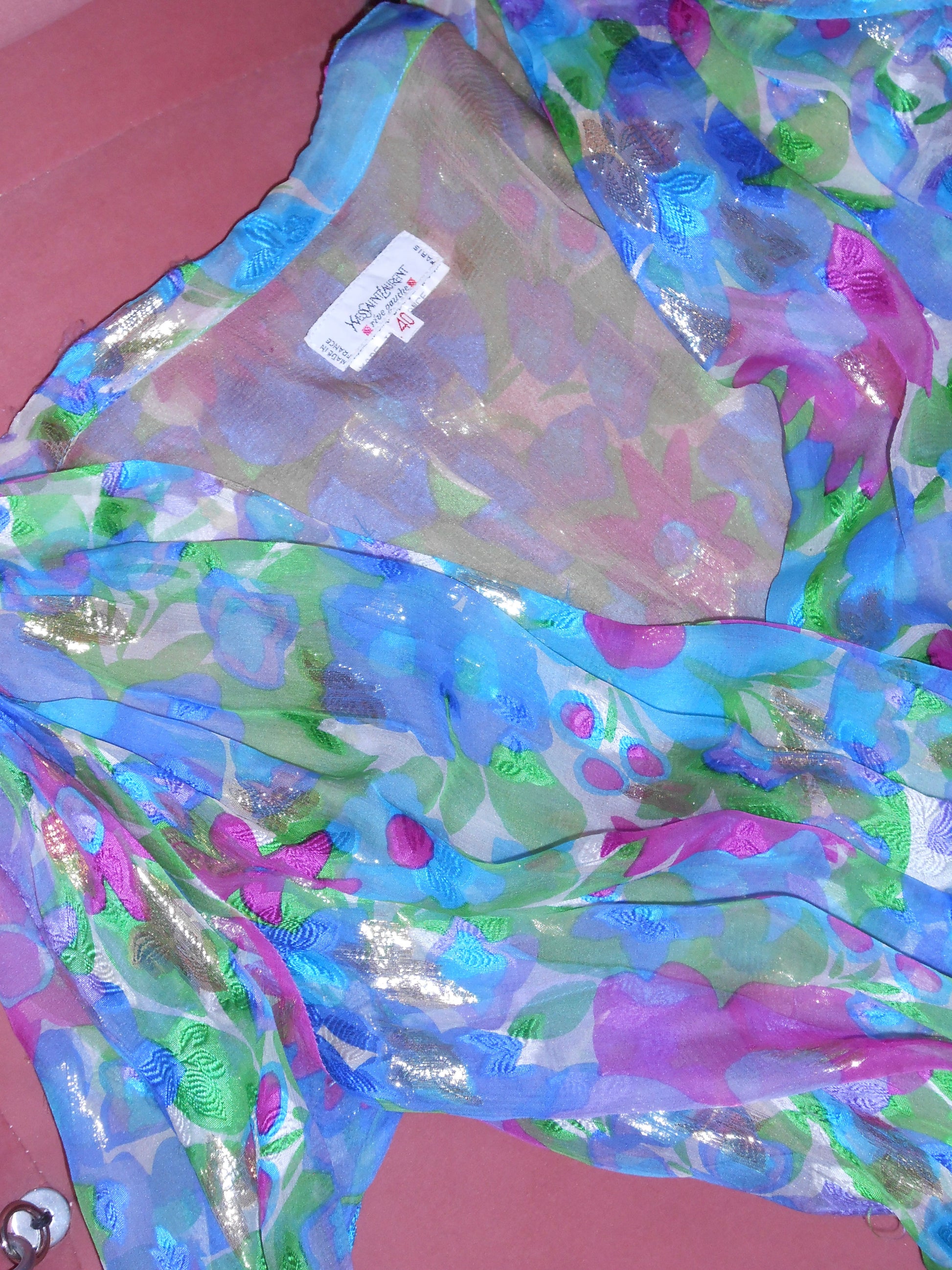 DESCRIPTION : A gorgeous silk blouse from Yves Saint Laurent, featuring a beautiful floral pattern with gold lamé thread and hues of blue and green and magenta. The blouse plunges at the neckline and wraps with a hook-and-eye closure. This creates a nice peplum cinched waist.