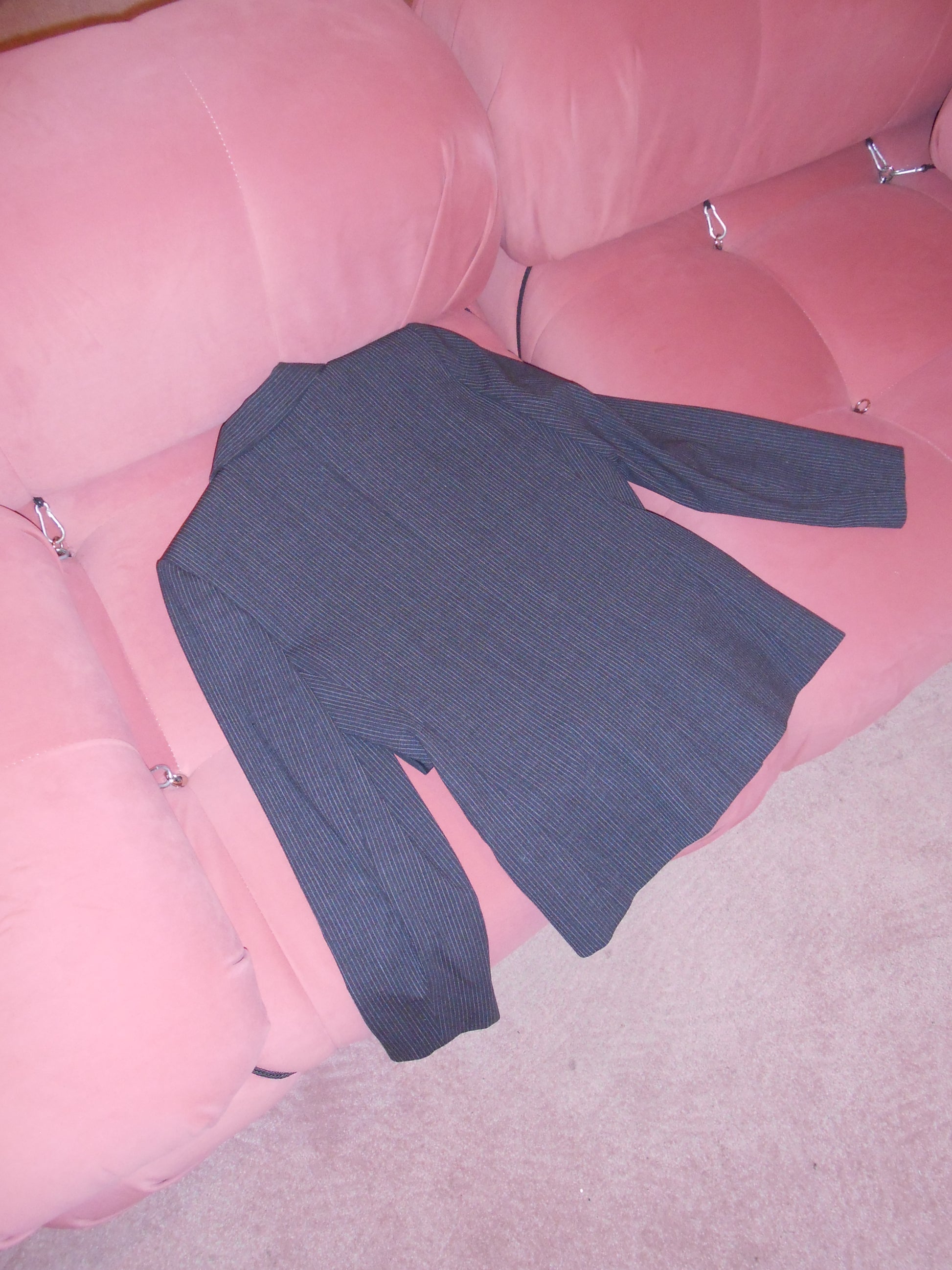 DESCRIPTION : A gorgeous wool pinstripe suit from Yves Saint Laurent's Variation line. Featuring very fine pinstripes and a modern silhouette. The jacket has 4 pockets at the front with a three button closure and strong lapels. The trousers are high waisted and straight in silhouette. A fabulous addition to any wardrobe.