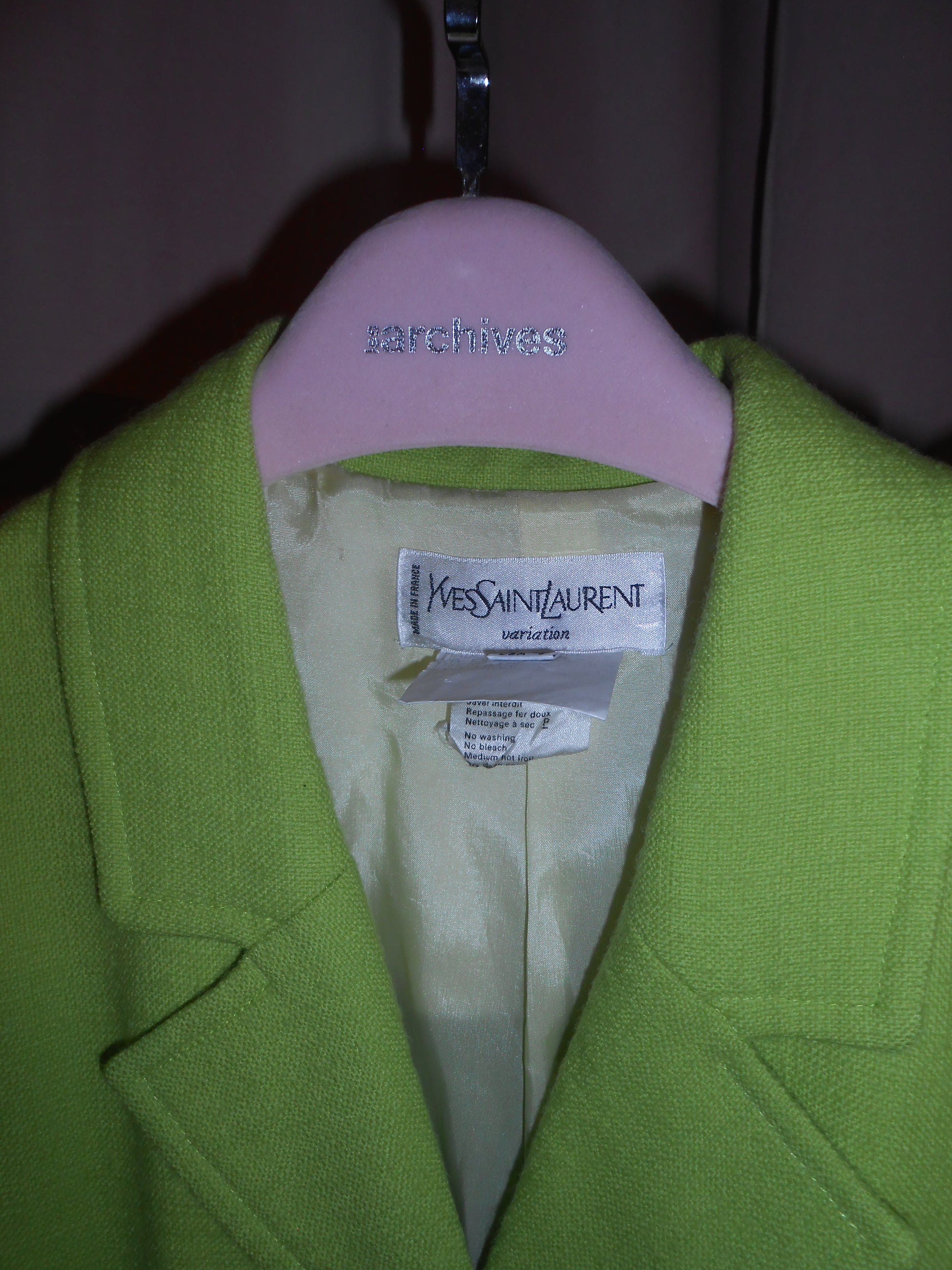 DESCRIPTION : Super fun wool citrus green skirt suit from YSL's SS 1996 collection for their Variation label. The jacket features gorgeous gold & green buttons and front pockets. The matching mini skirt fits high waisted and hits just above the knee.